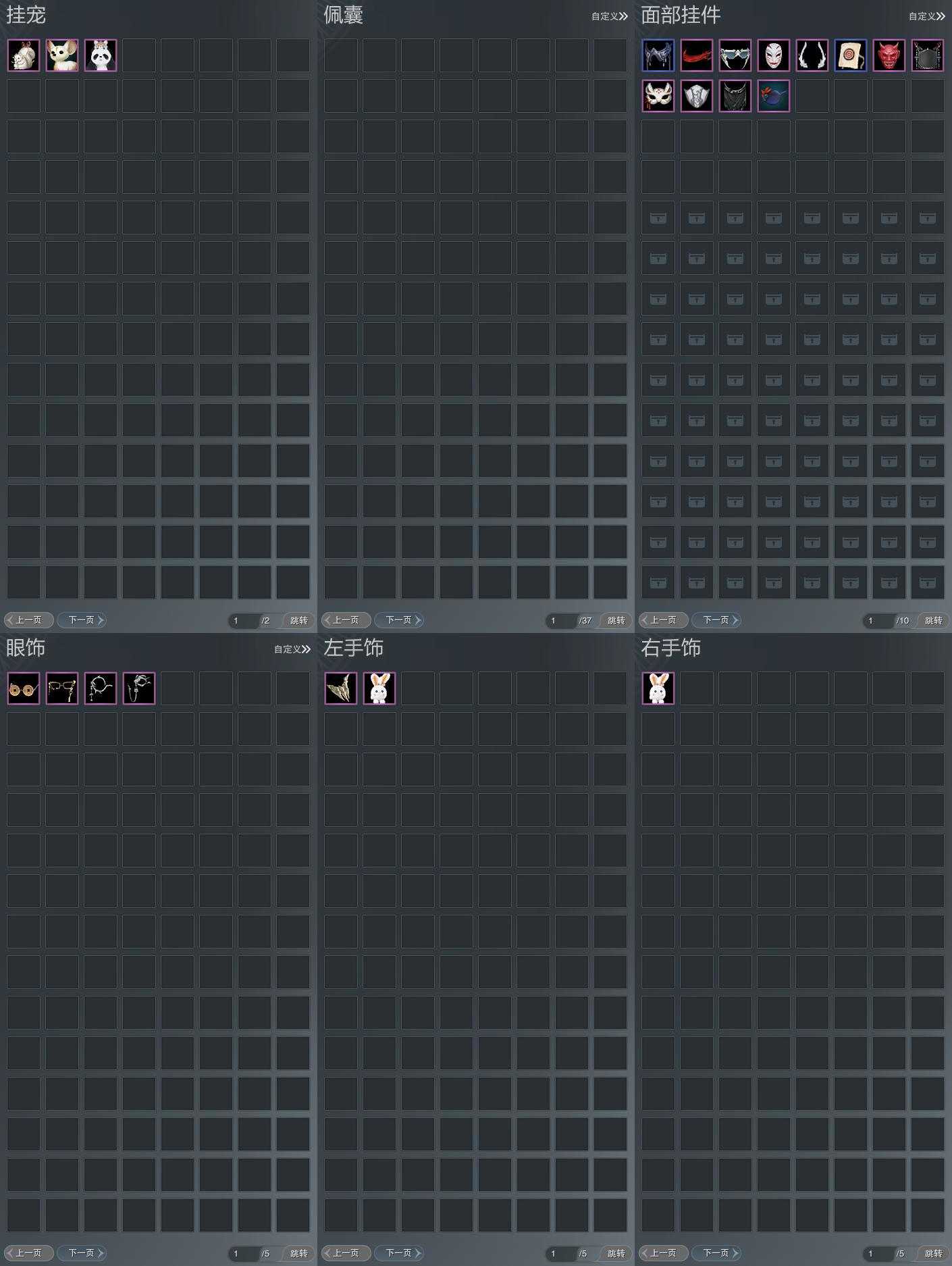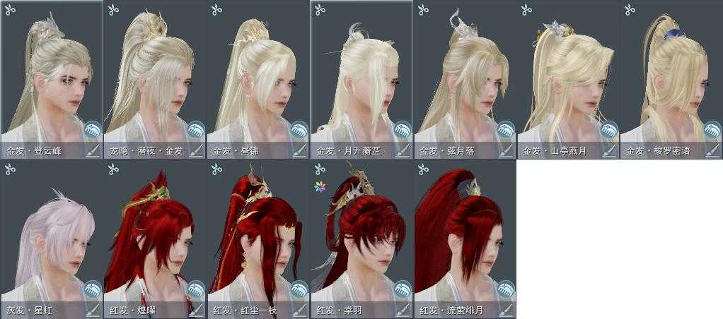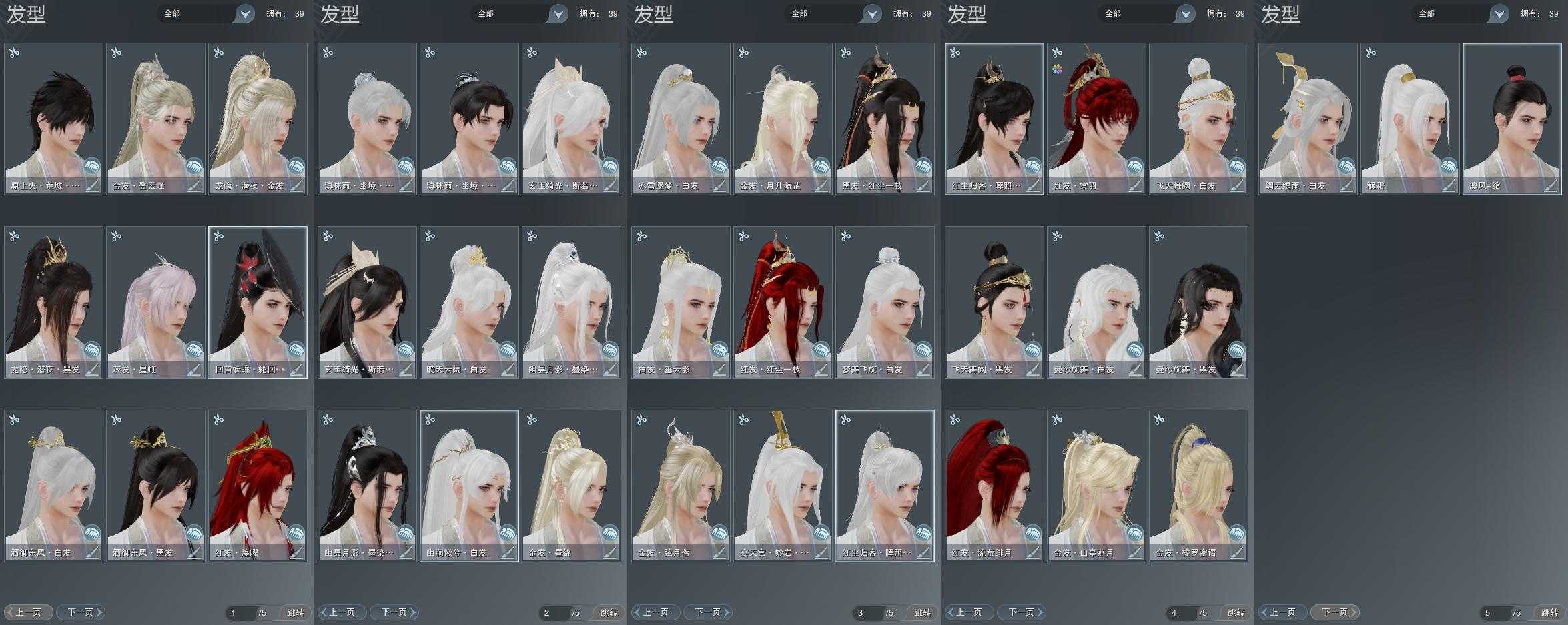 【发型】金发7个[资历金, 国金, 巴卡金, 香蕉金, 虎金, 三代金, 黑龙隐金发], 红发5个[十红, 十二红, 兔红, 小资历红, 二代灰], 黑发12个, 白发15个, 盒子发型[丝路黑, 飞天黑发, 丝路白, 飞天白发, 黑红尘黑发, 黑红尘白发, 黑狮白发, 十二黑, 小熊白发, 花滑白发, 黑幽昙黑发, 幽涧愀兮白发, 白玄玉黑发, 黑傣族黑发, 黑幽昙白发, 卿酒盒黑发, 白雪人白发, 黑傣族白发, 红黑妖眸盒黑发, 卿酒盒白发, 黑龙隐黑发, 黑上火黑发], 总页数5