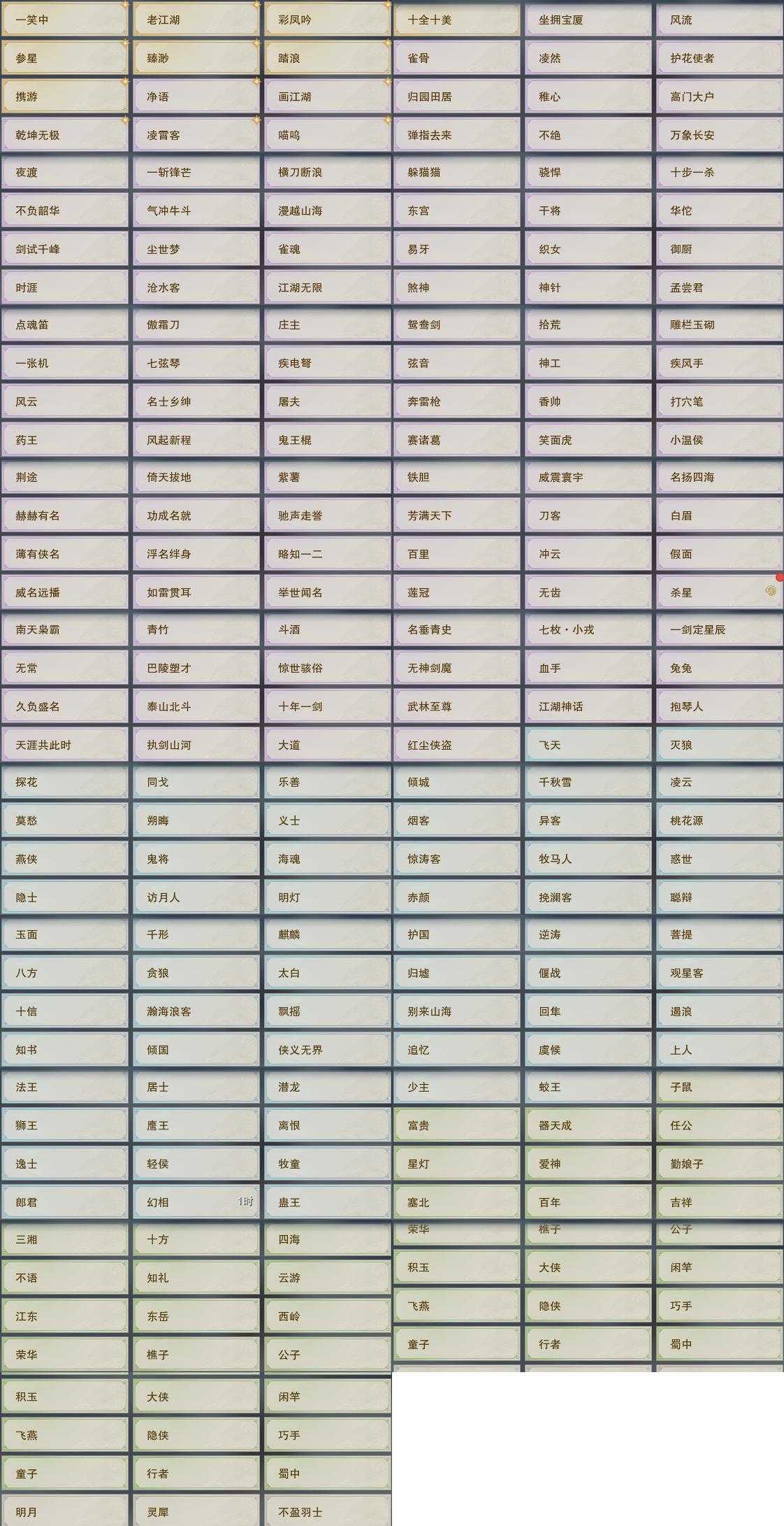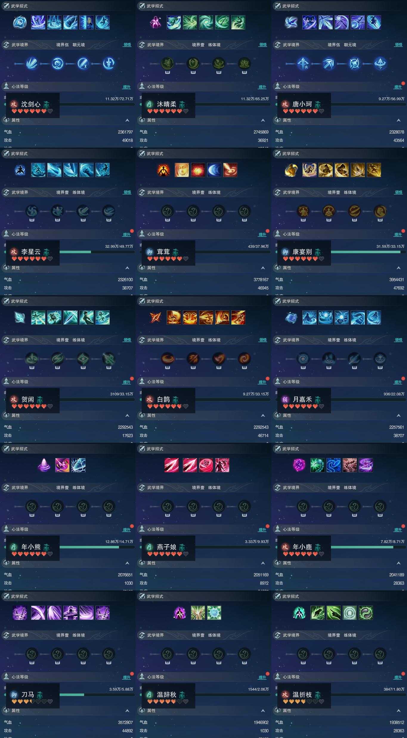【同伴】沈剑心83级境界伍,沐晴柔81级境界壹,唐小珂80级境界伍,李星云79级境界壹,茸茸志77级境界壹,康宴别76级境界壹,贺闲志76级境界壹,白鹊志76级境界壹,月嘉禾73级境界壹,年小熊70级境界壹,燕子娘67级境界壹,年小鹿66级境界壹,刀马志63级境界壹,温辞秋55级境界壹,温折枝54级境界壹