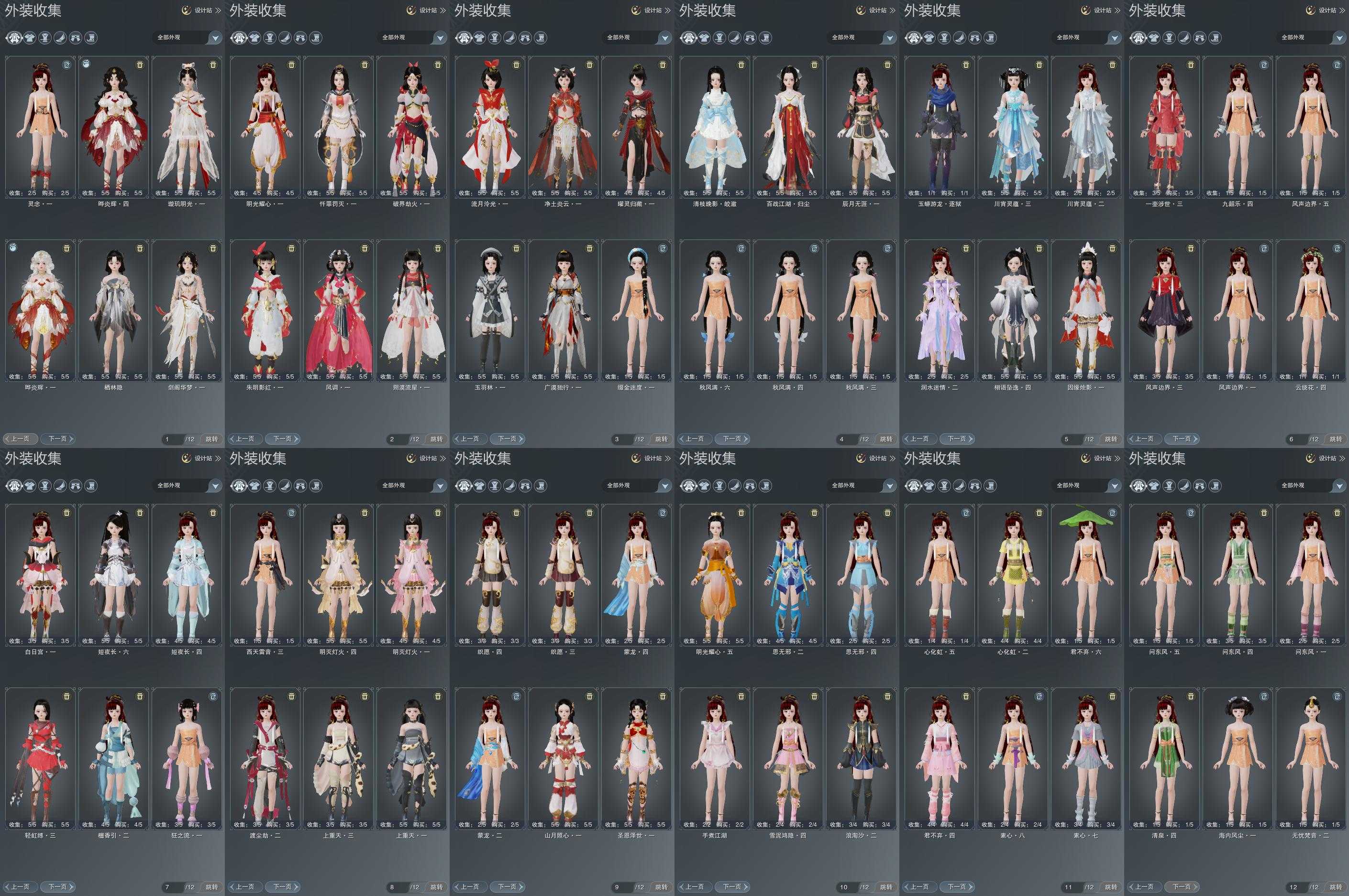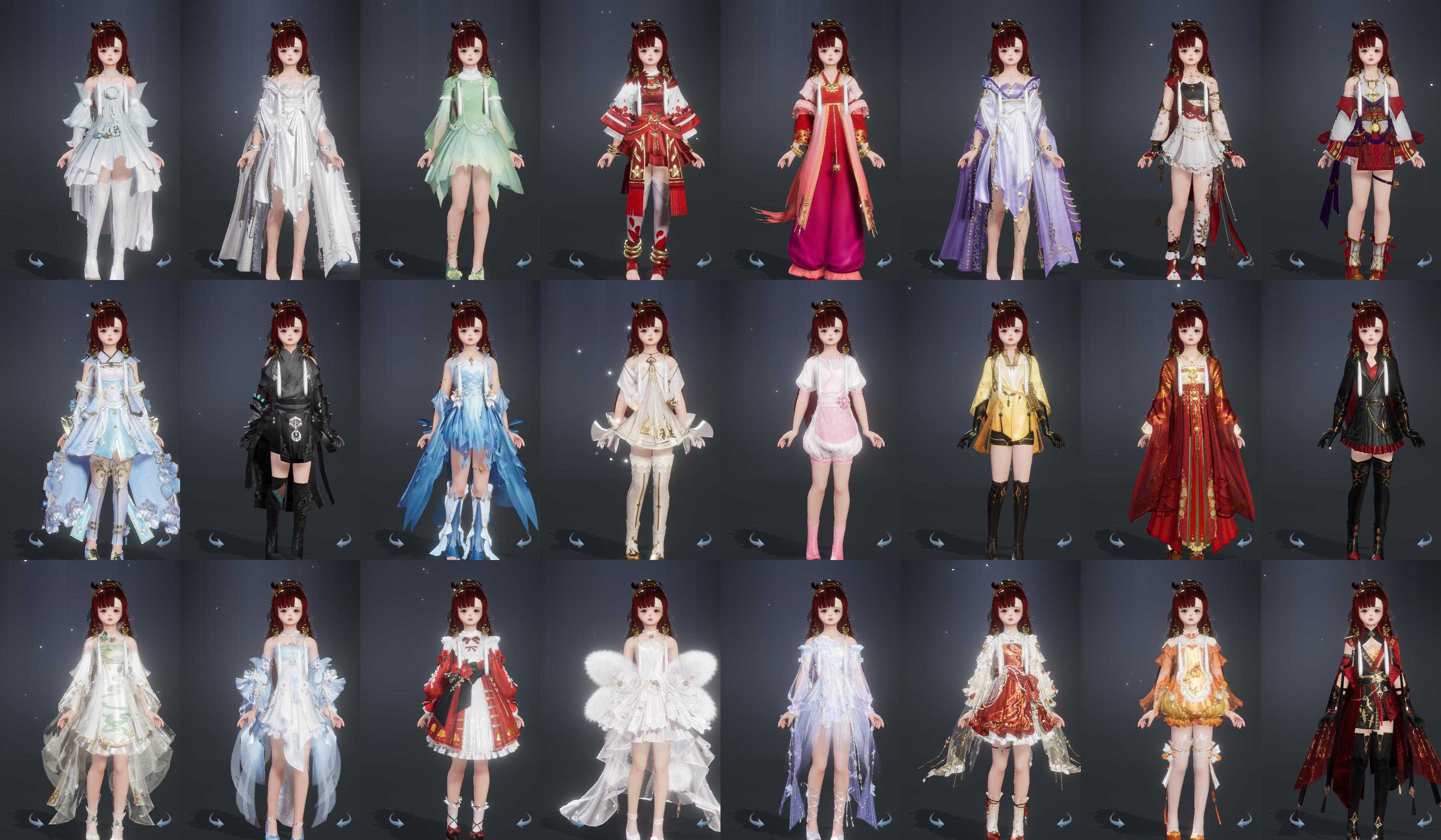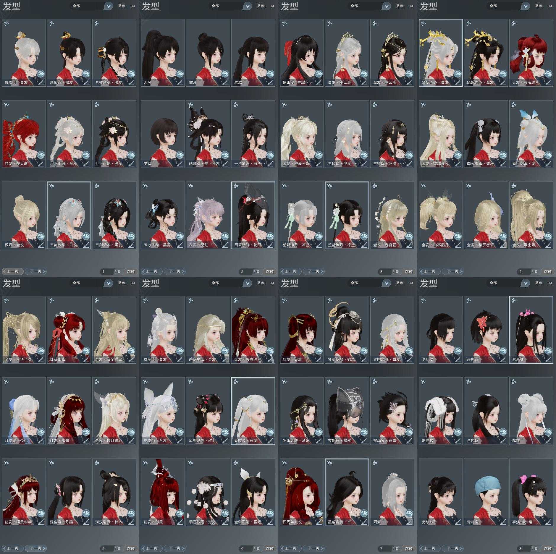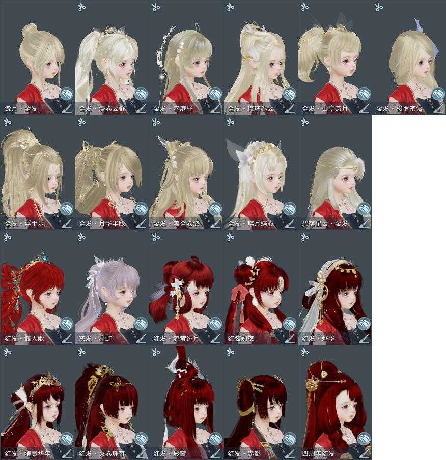 【发型】金发11个[狐金, 资历金, 鼠金, 鸡金, 蝶金, 喵金, 国金, 苏金, 龙女金, 云金, 傲月金发], 红发10个[四红, 五红, 六红, 七红, 羊红, 猴红, 鸡红, 小资历红, 十五红, 二代灰], 黑发33个, 白发15个, 盒子发型[一代蓝中秋白, 四代七夕黑发, 雪月白发, 四代七夕白发, 绿中秋黑发, 浮岚黑发, 绿中秋白发, 浮岚白发, 红椿山黑发, 红黑妖眸盒黑发, 蓝兔盒黑发, 紫沧洲盒黑发, 白幽馥黑发, 九七黑发, 柿盒黑发, 镰刀黑发, 九七白发, 镰刀白发], 总页数8