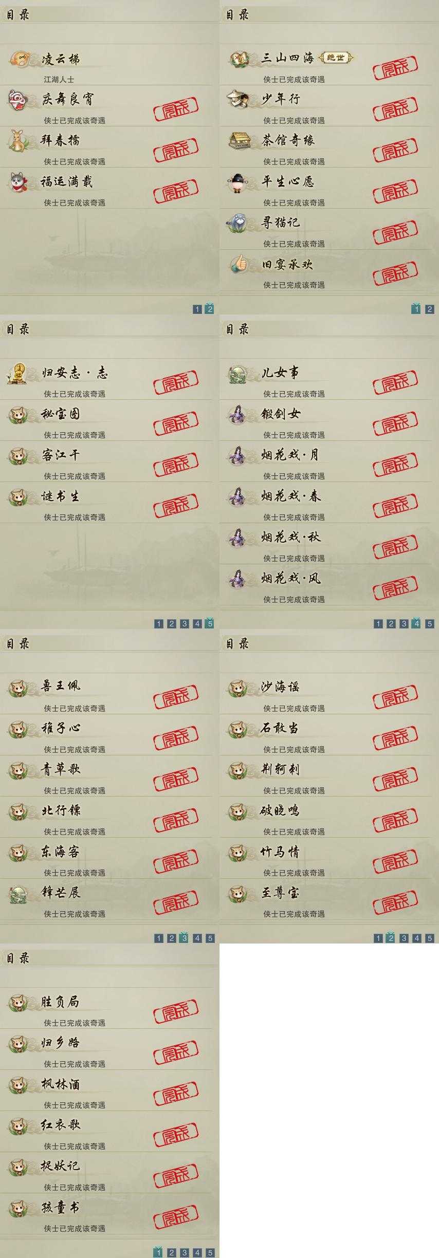 【奇遇】10个[三山四海, 平生心愿, 少年行, 茶馆奇缘, 寻猫记, 庆舞良宵, 凌云梯, 旧宴承欢, 拜春擂, 福运满载]