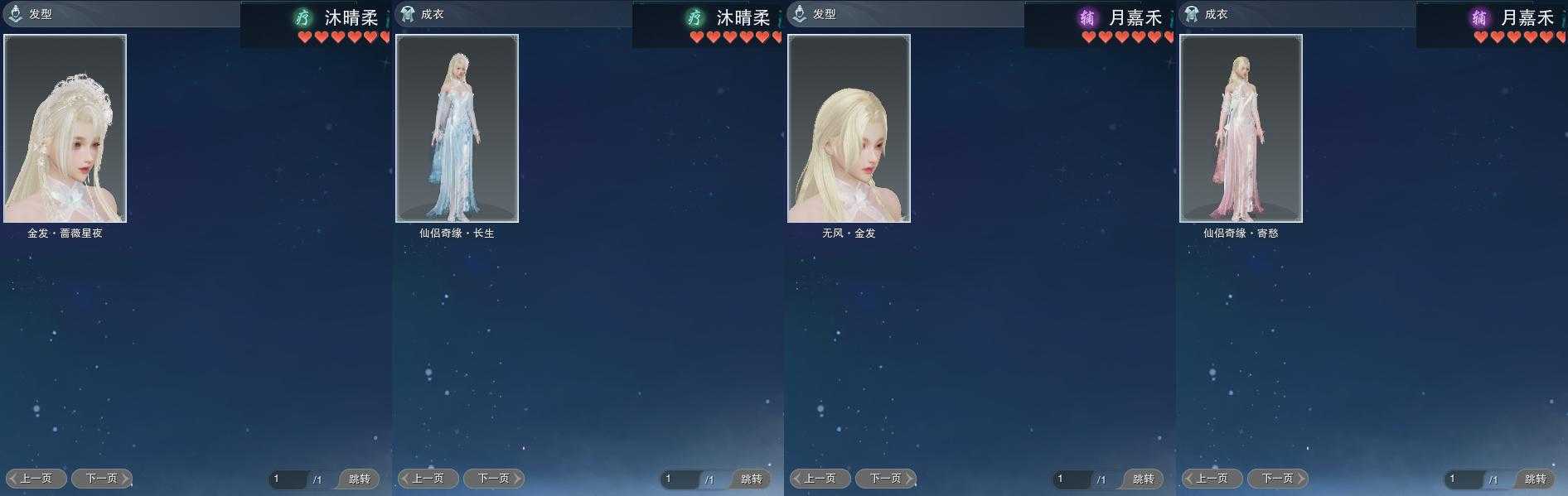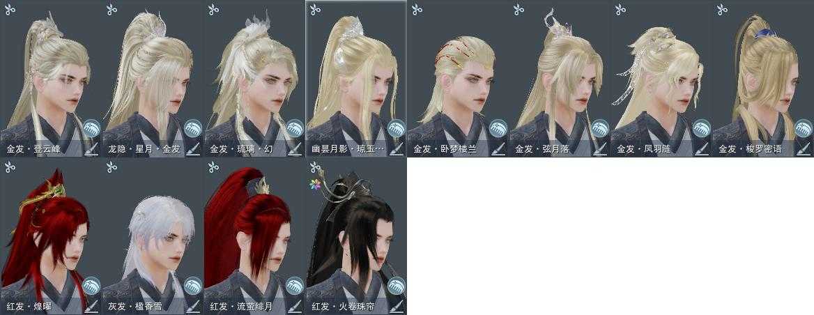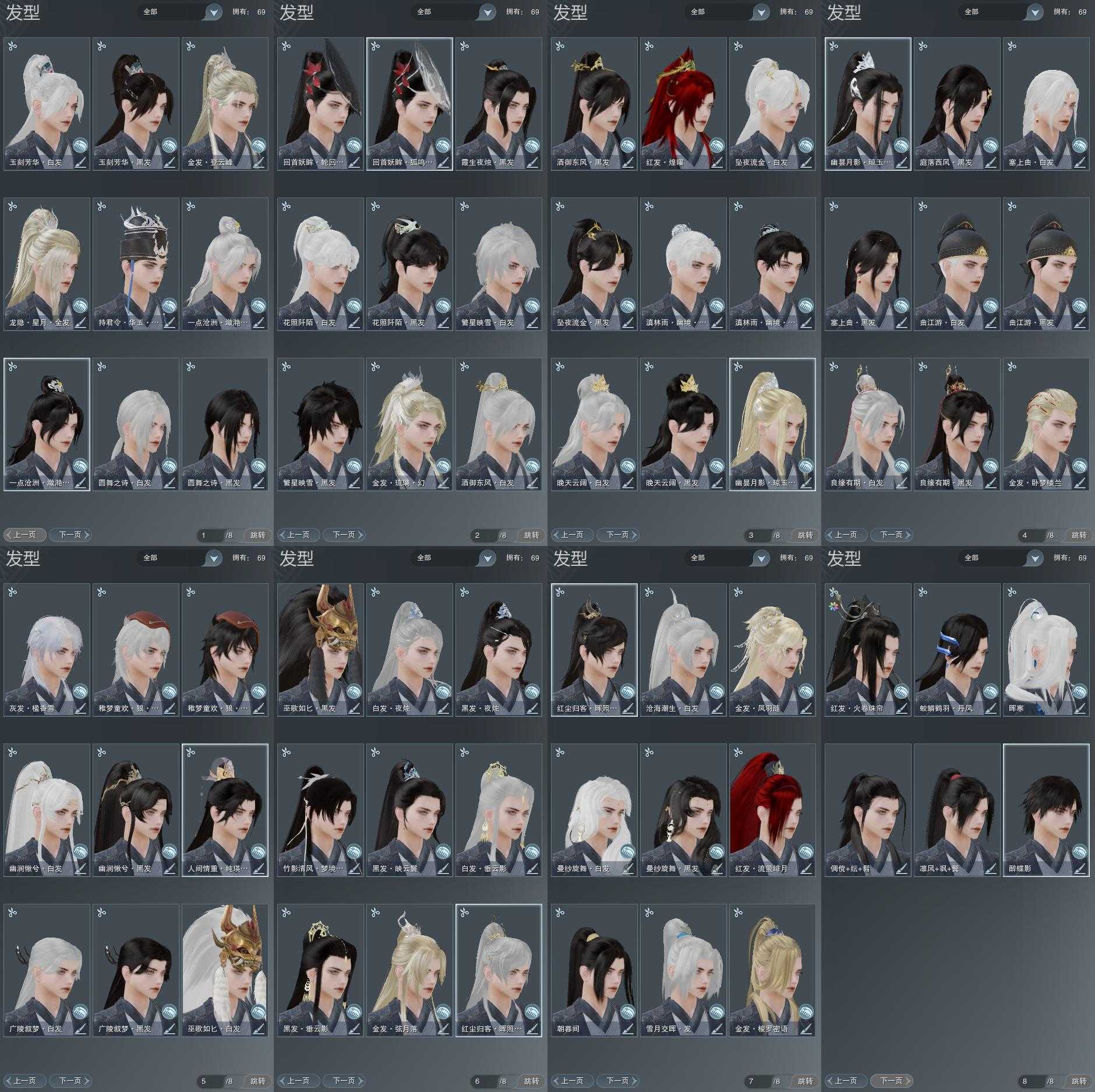 【发型】金发10个[资历金, 凤金, 巴卡金, 女仆金, 海金, 蔷薇金, 三代金, 无风金发, 白幽昙金发, 紫龙隐金发], 红发4个[六红, 兔红, 小资历红, 一代灰], 黑发32个, 白发23个, 盒子发型[曲江游白发, 丝路黑, 雪月白发, 丝路白, 黑红尘黑发, 沧海白发, 黑红尘白发, 竹影梦境黑发, 巫歌如匕黑发, 古琴黑发, 巫歌如匕白发, 紫人间黑发, 狼盒黑发, 古琴盒白发, 七七黑发, 曲江游黑发, 狼盒白发, 七七白发, 白幽昙黑发, 幽涧愀兮白发, 黑傣族黑发, 金鳞盒黑发, 卿酒盒黑发, 不良人盒黑发, 黑傣族白发, 踏青黑发, 金鳞盒白发, 红白妖眸盒黑发, 红黑妖眸盒黑发, 卿酒盒白发, 不良人盒白发, 圆舞盒黑发, 蓝沧洲盒黑发, 踏青白发, 白持君盒黑发, 圆舞盒白发, 蓝沧洲盒白发], 总页数8