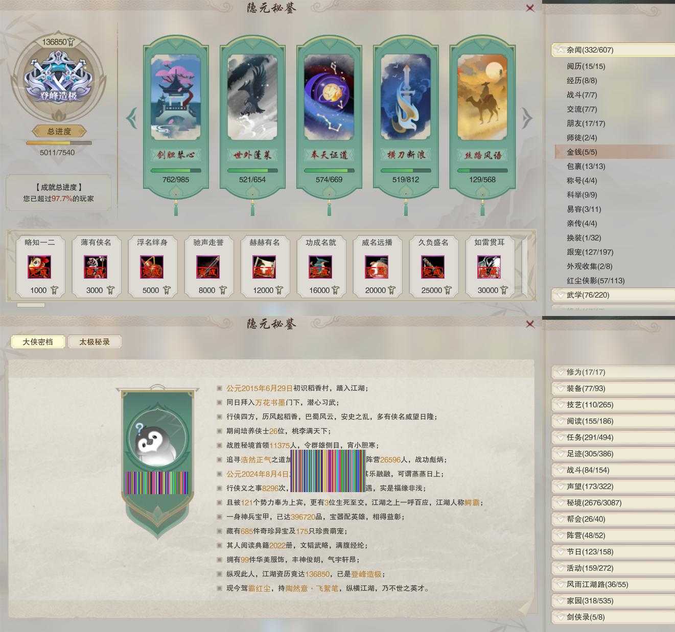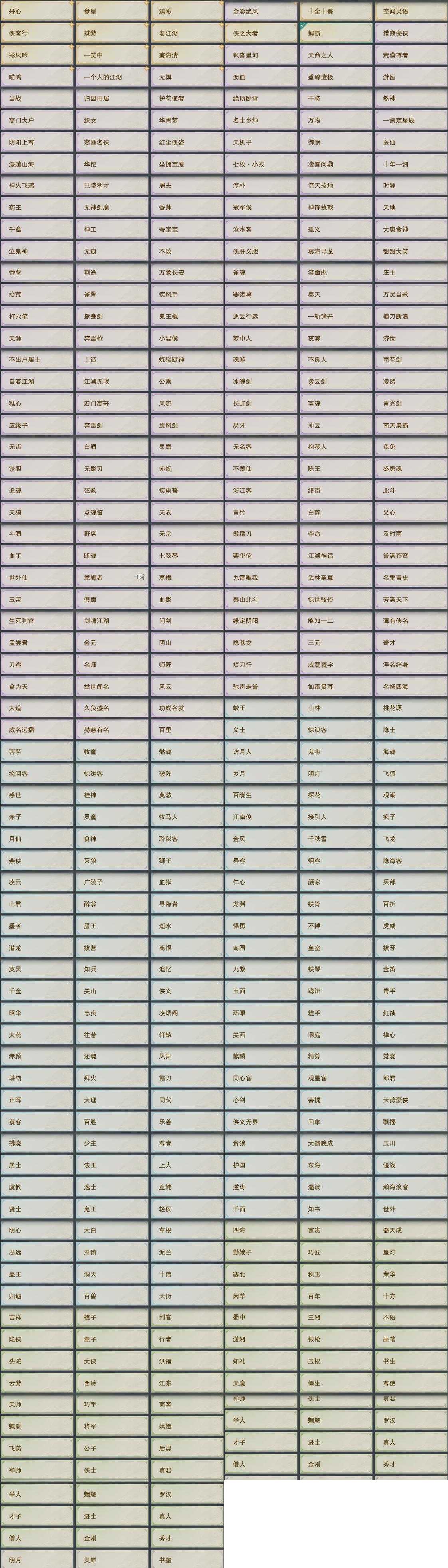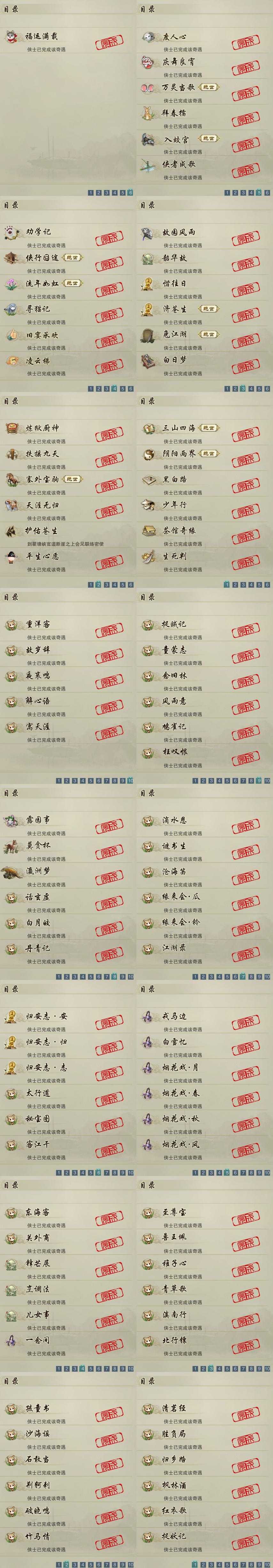 【奇遇】31个[白日梦, 天涯无归, 三山四海, 劝学记, 阴阳两界, 兔江湖, 平生心愿, 黑白路, 惜往日, 塞外宝驹, 韶华故, 济苍生, 护佑苍生, 少年行, 故园风雨, 扶摇九天, 流年如虹, 侠行囧途, 寻猫记, 茶馆奇缘, 庆舞良宵, 万灵当歌, 入蛟宫, 生死判, 凌云梯, 炼狱厨神, 度人心, 旧宴承欢, 侠者成歌, 拜春擂]