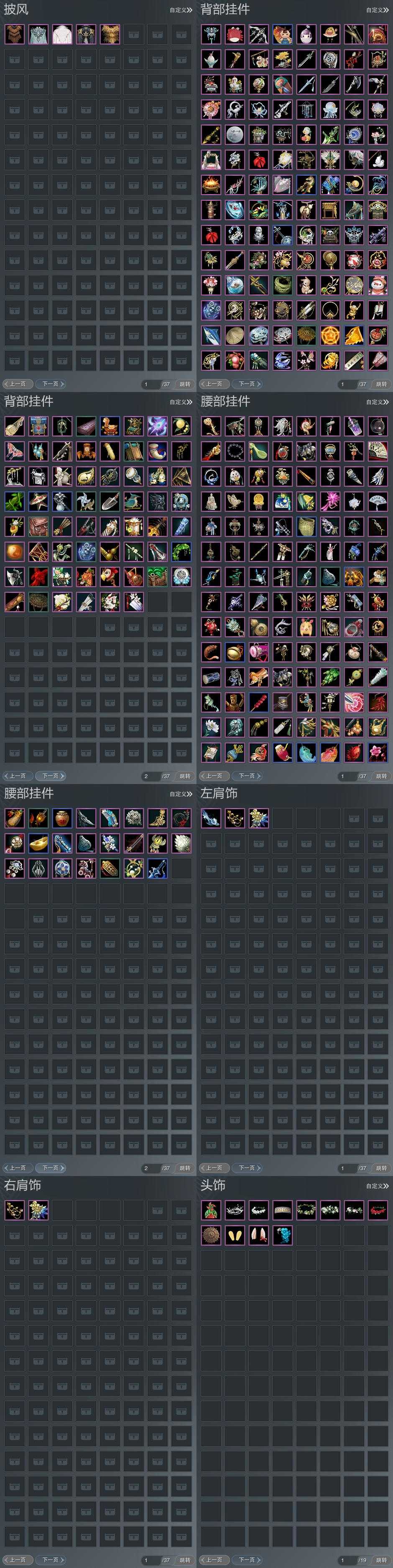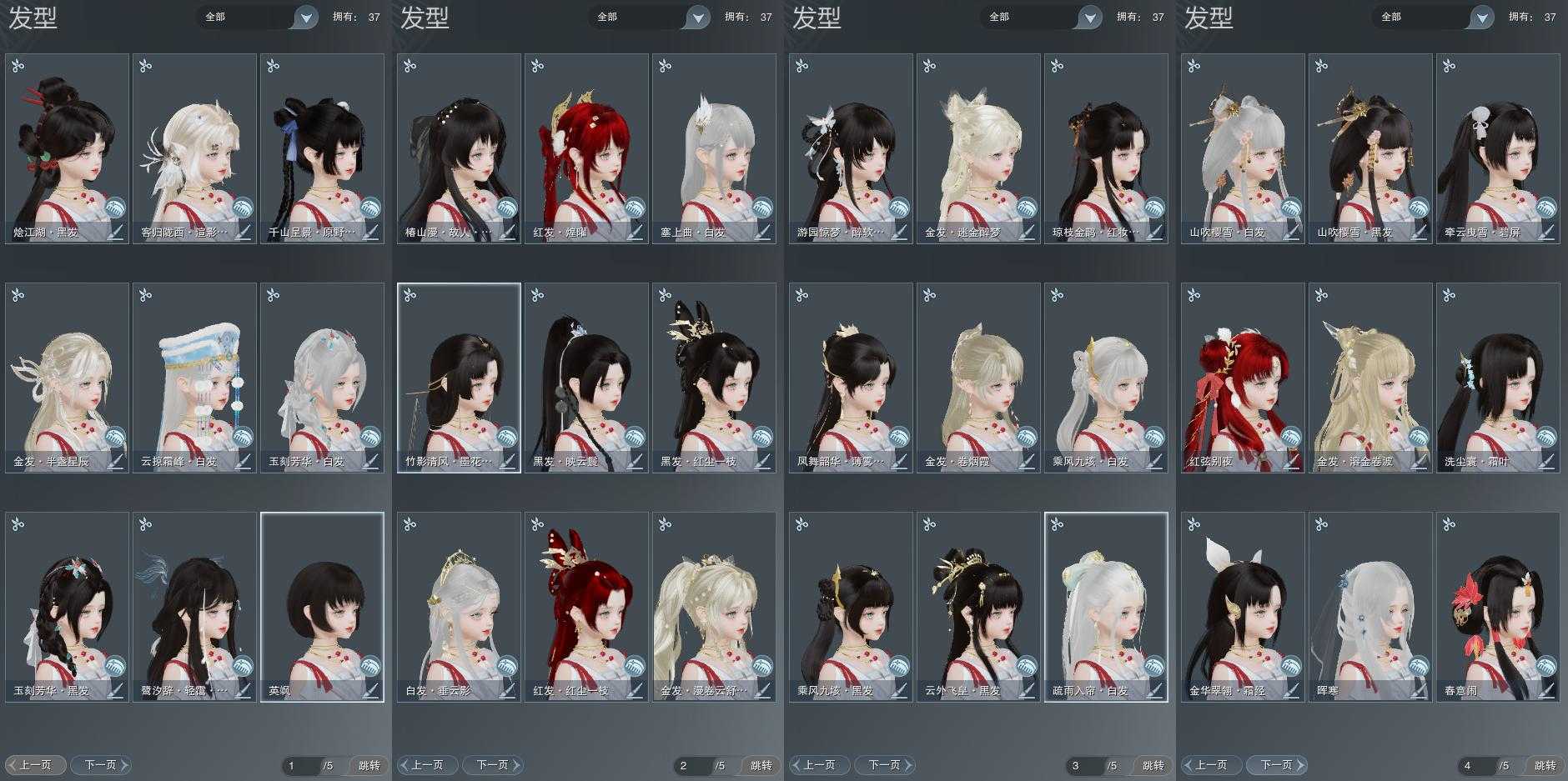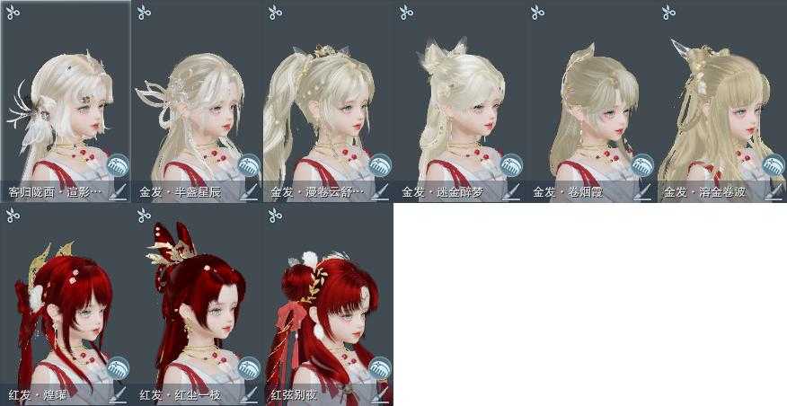 【发型】金发7个[蝶金, 角金, 牛金, 云金, 傲月金发, 精灵金, 灰陇西金发], 红发3个[十二红, 鸡红, 兔红], 黑发19个, 白发8个, 盒子发型[山吹樱雪黑发, 飞皇黑发, 二代乘风黑发, 山吹樱雪白发, 澡盒白发, 二代乘风白发, 薄雾黑发, 红琼枝黑发, 新蓝游园黑, 十二黑, 竹影墨花黑发, 黑椿山黑发, 蓝鹭黑发, 蓝千山黑发, 云掠霜峰白发], 总页数5