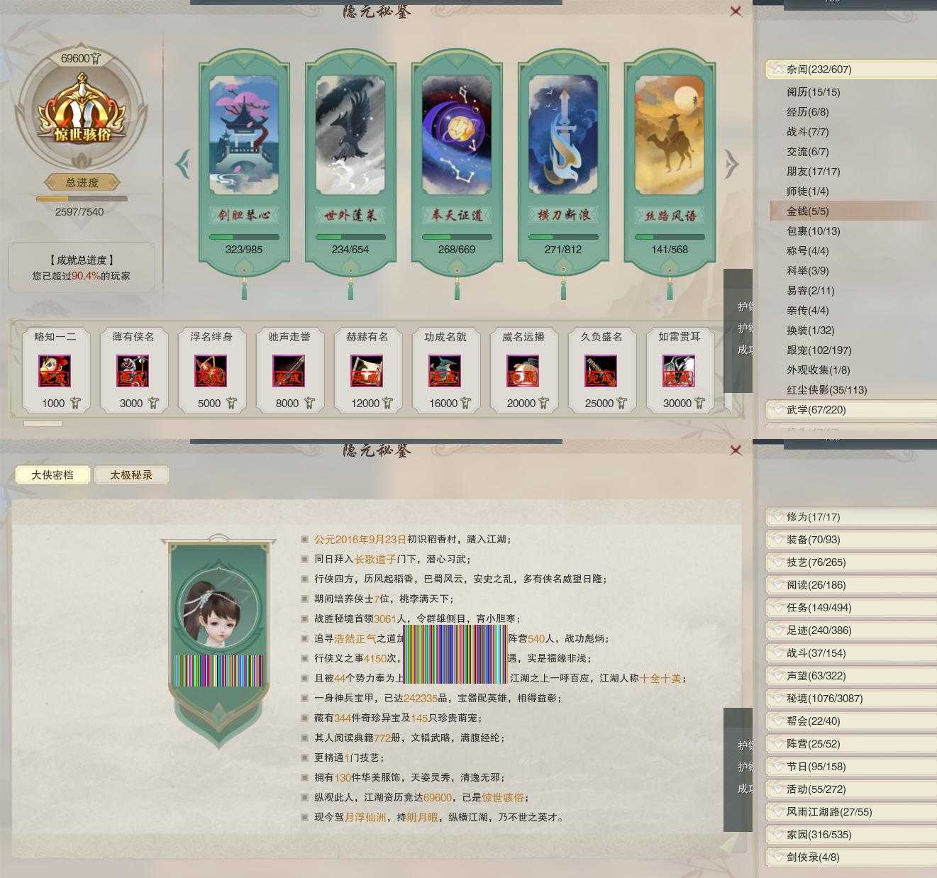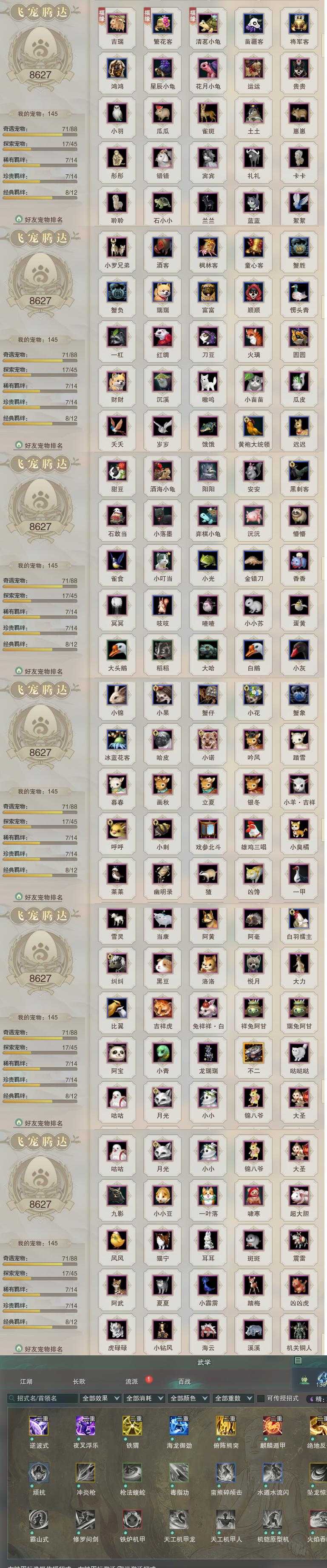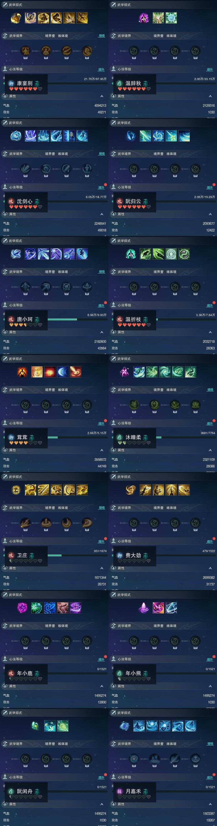 【同伴】康宴别84级境界壹,温辞秋76级境界壹,沈剑心73级境界壹,阮归云72级境界壹,唐小珂67级境界壹,温折枝65级境界壹,茸茸志62级境界壹,沐晴柔47级境界壹,卫庄志18级境界壹,费大劲2级境界壹,年小鹿1级境界壹,年小熊1级境界壹,阮闲舟1级境界壹,月嘉禾1级境界壹
