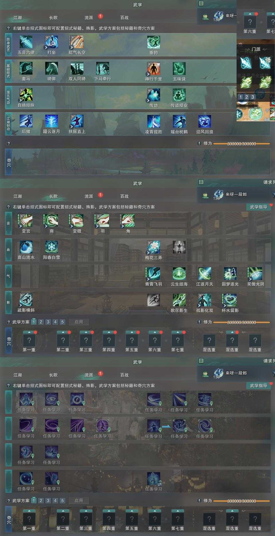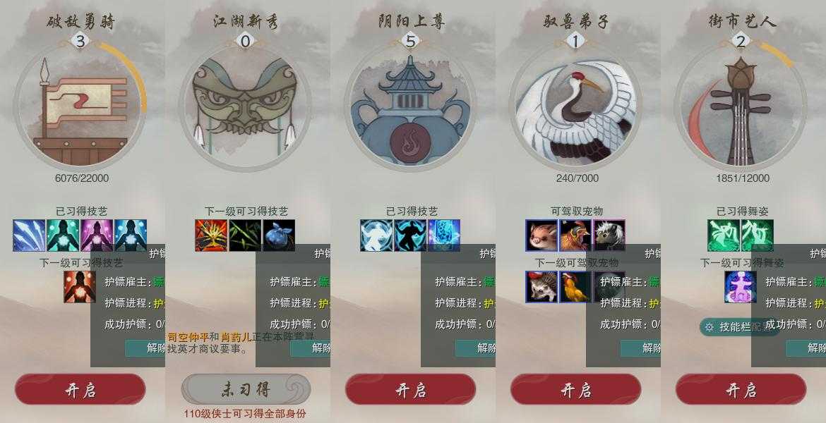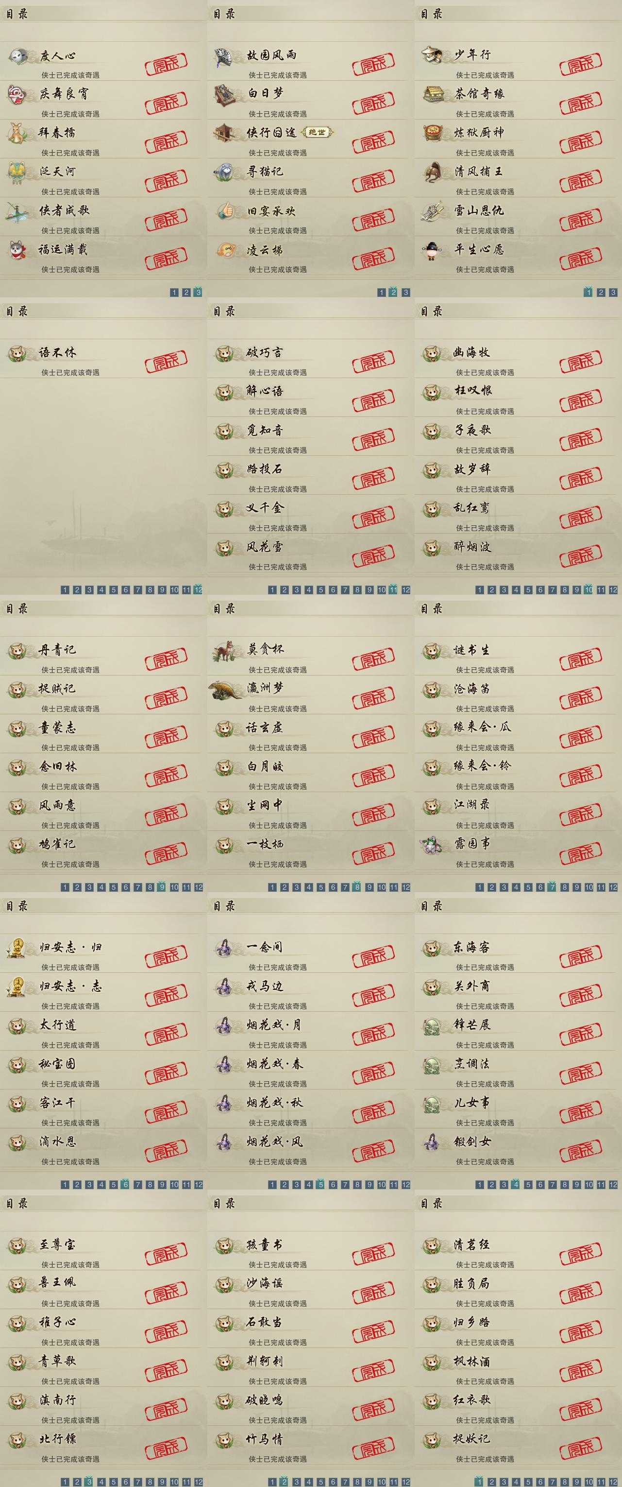 【奇遇】18个[白日梦, 雪山恩仇, 平生心愿, 少年行, 故园风雨, 清风捕王, 侠行囧途, 寻猫记, 茶馆奇缘, 庆舞良宵, 凌云梯, 炼狱厨神, 度人心, 旧宴承欢, 泛天河, 侠者成歌, 拜春擂, 福运满载]