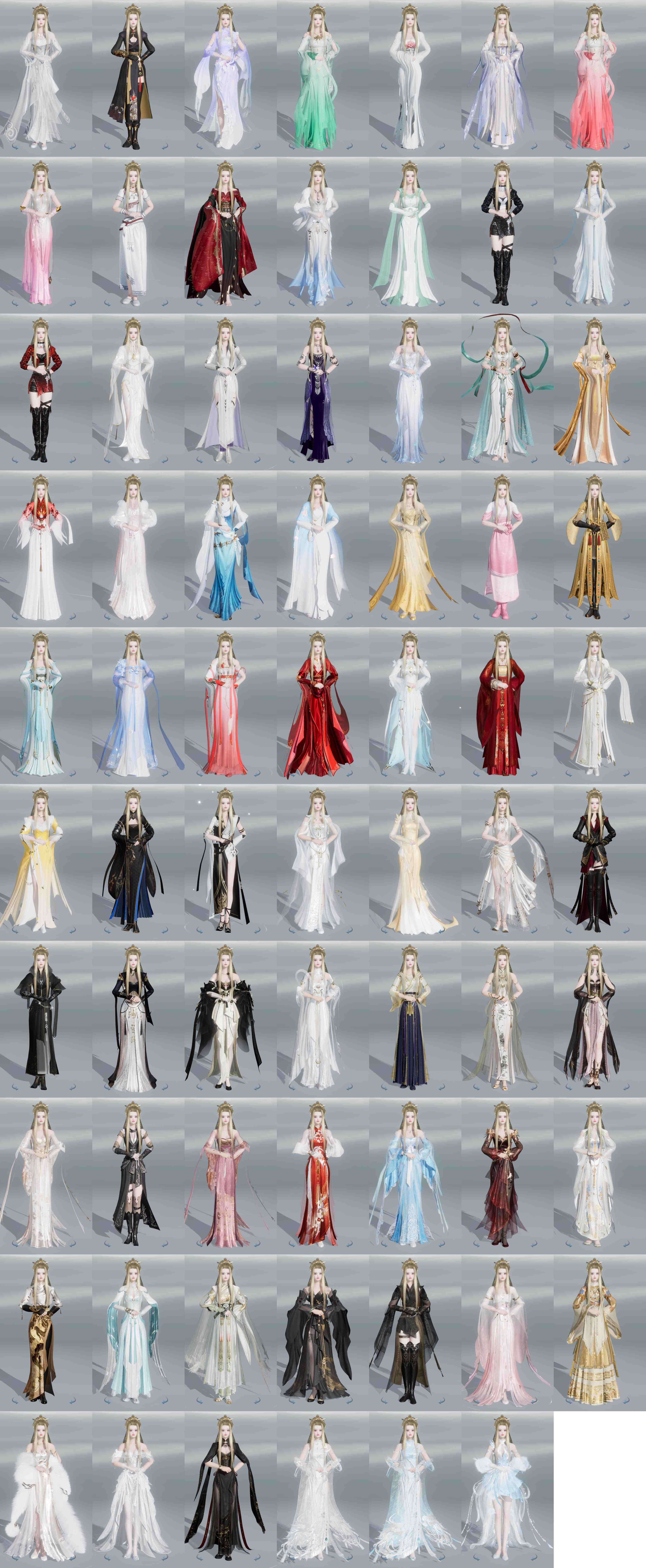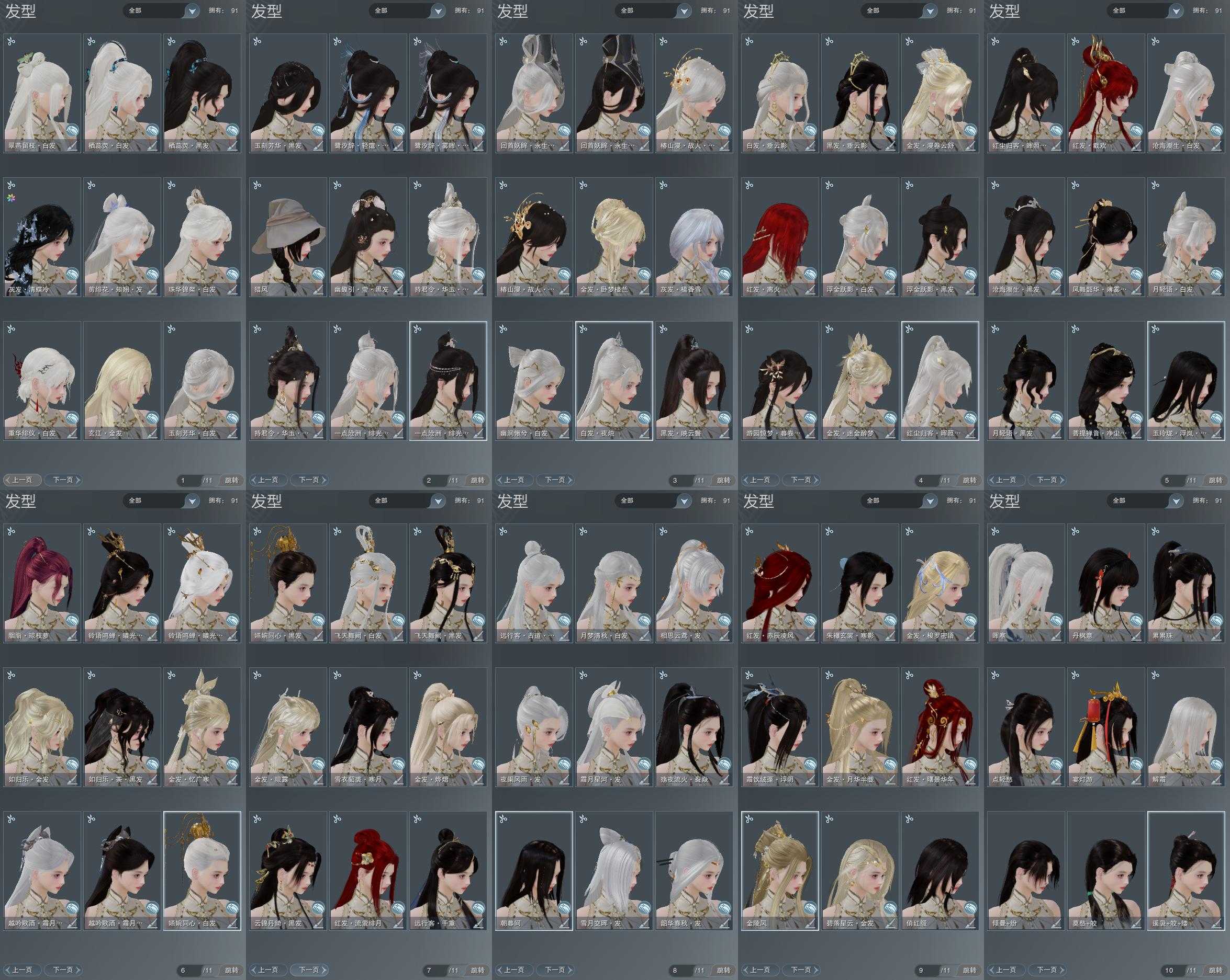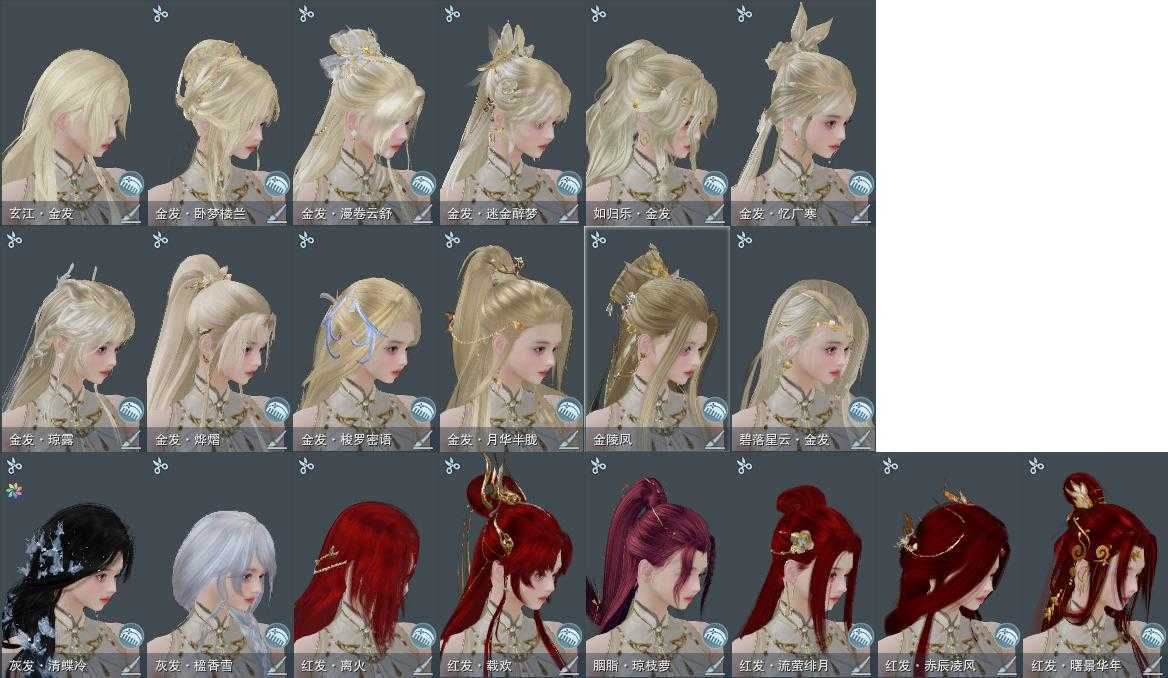 【发型】金发12个[一代金, 兔金, 资历金, 鸡金, 苏金, 猪金, 珊瑚金, 如归金, 牛金, 云金, 女仆金, 玄江金发], 红发8个[八红, 紫发, 蝶粉, 猴红, 牛红, 小资历红, 大资历红, 一代灰], 黑发37个, 白发29个, 盒子发型[二代七夕白, 飞天黑发, 四代七夕黑发, 四代中秋蓝黑发, 白端午白发, 黑端午白发, 三代中秋白, 三代七夕白, 雪月白发, 白楼兰黑发, 飞天白发, 四代七夕白发, 四代中秋蓝白发, 白楼兰白发, 浮岚黑发, 净尘黑发, 月轻语黑发, 薄雾黑发, 沧海黑发, 黑红尘黑发, 月轻语白发, 红游园黑发, 沧海白发, 小金龙黑发, 黑红尘白发, 小金龙白发, 幽涧愀兮白发, 黑椿山黑发, 棕黑妖眸盒黑发, 黑椿山白发, 粉沧洲盒黑发, 棕黑妖眸盒白发, 白持君盒黑发, 粉沧洲盒白发, 白幽馥黑发, 白持君盒白发, 白鹭黑发, 蓝鹭黑发], 总页数11
