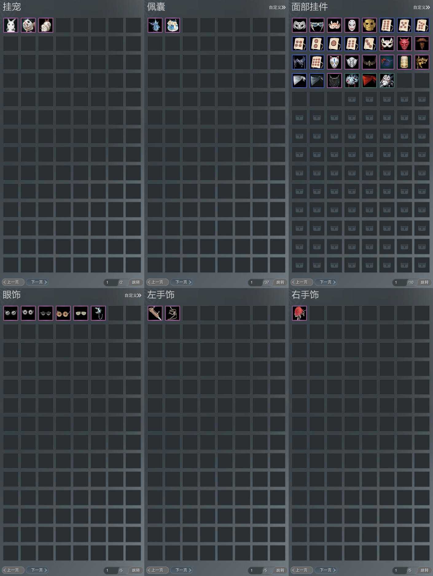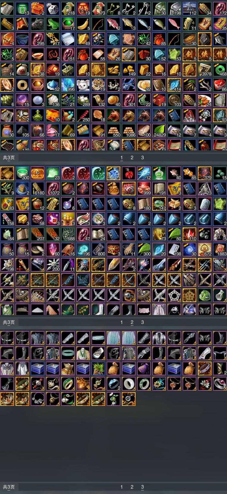 盒子:[白端午盒(缺腰挂), 雪月盒, 歌盒, 猪盒, 二七盒, 旗袍盒, 三七盒, 四代七夕盒, 白凤舞盒(标), 貂盒, 毒盒, 三中盒, 蓬莱盒, 四中蓝盒, 飞天盒, 白菩提盒(标), 青盒, 白如归盒(缺黑发), 沧海盒, 白楼兰盒, 红游园(标), 小金龙盒, 棕黑妖龙盒(豪), 粉沧州盒(豪), 白持君令(豪), 黑椿山盒(豪), 白幽馥(标), 白鹭笠盒(标), 蓝鹭盒(标)]
