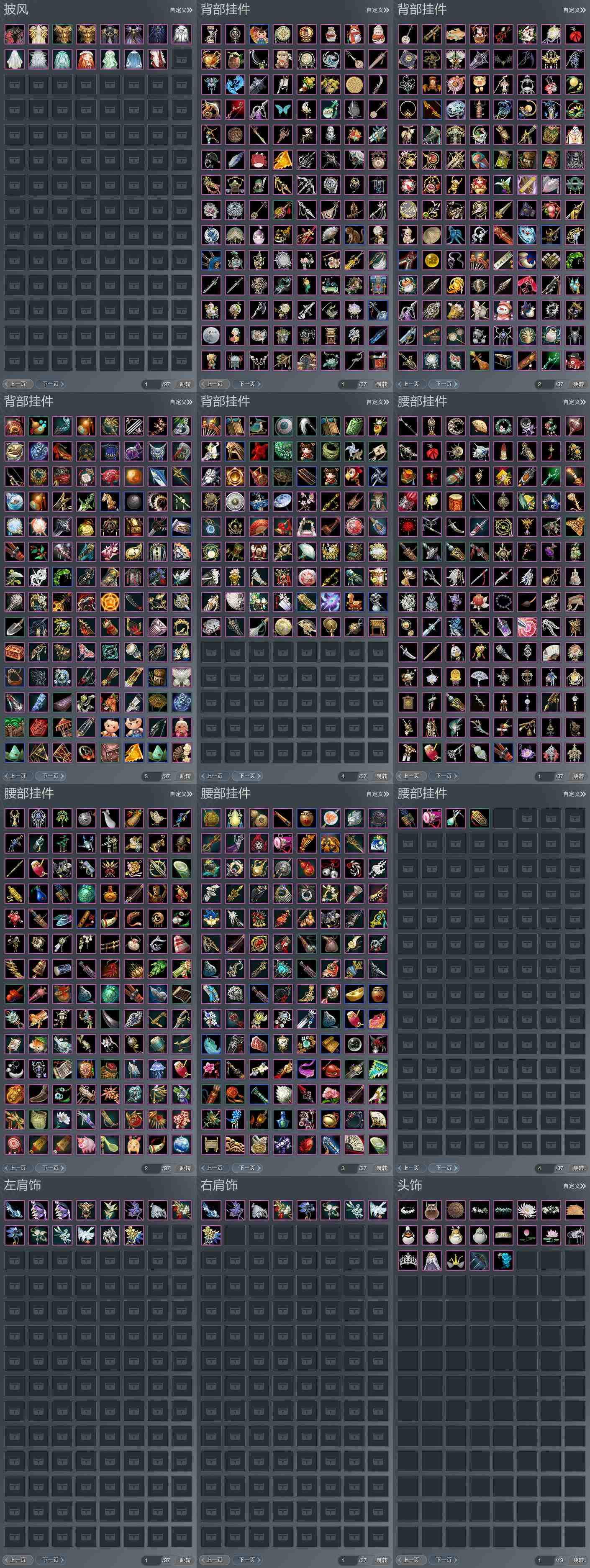 【肩饰】14左,9右,[双鱼曳波·极乐·左, 虞渊引梦·左, 霜岱应元·左, 云中雪霁·左, 碧海云仙·左, 碧翎叠云·左, 鹤影天青·左, 赤羽逍遥·左][虞渊引梦·右, 霜岱应元·右, 云中雪霁·右, 碧海云仙·右, 碧翎叠云·右, 鹤影天青·右]