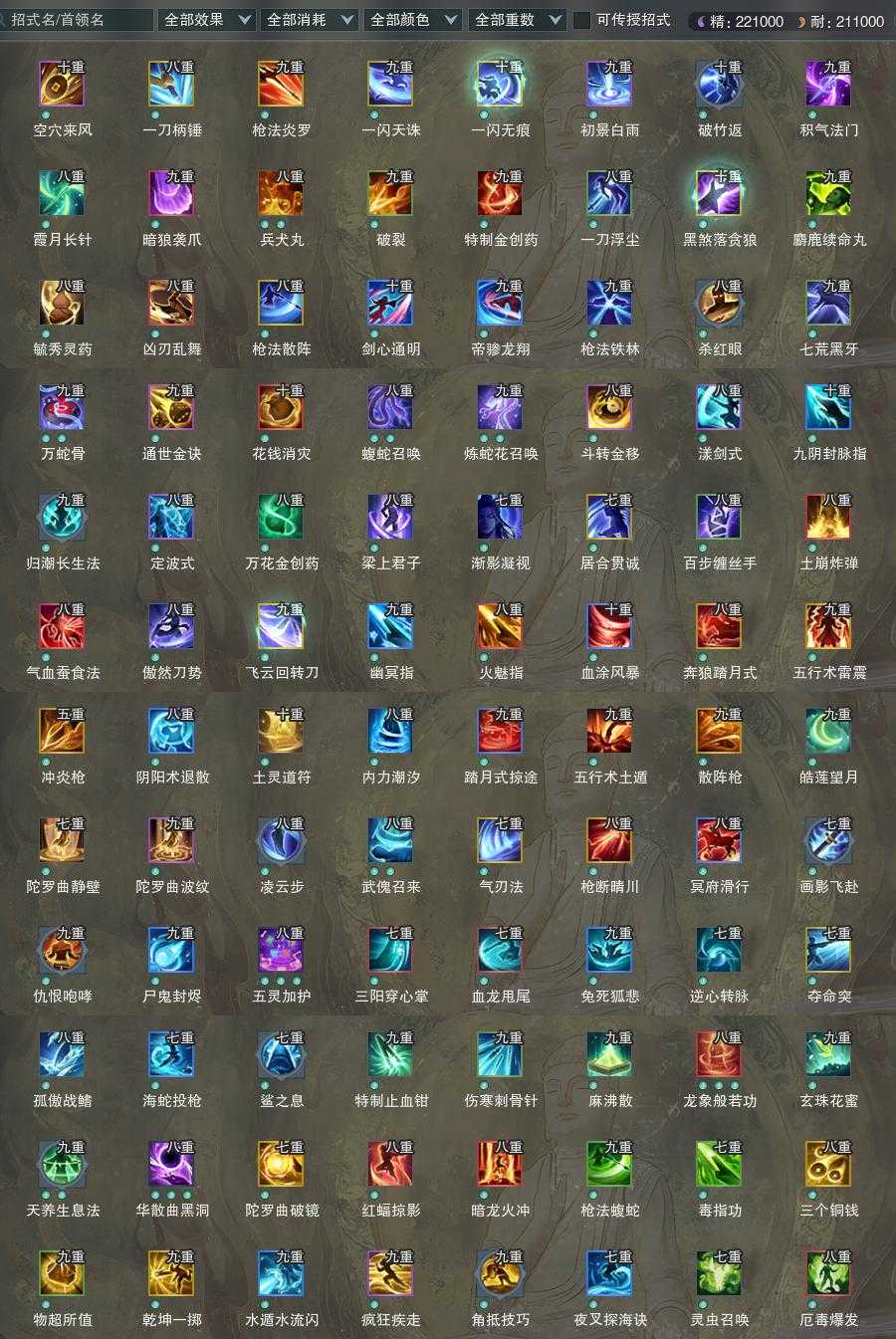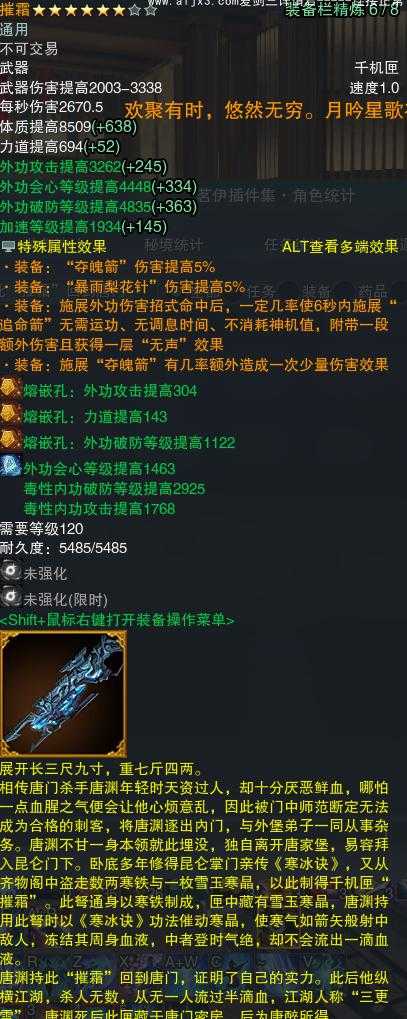【橙武】(仅本门派)[120小铁*72, 130小铁*47, 十五W奇遇书*1, 十四W奇遇书*1, 110玄晶*1, 95玄晶*2, 70玄晶*1, 110小铁*156, 100小铁*301, 95小铁*527, 90小铁*151, 80小铁*295, 70小铁*172, 120CW摧霜, 70CW含沙射影, 门派特效八相连珠]