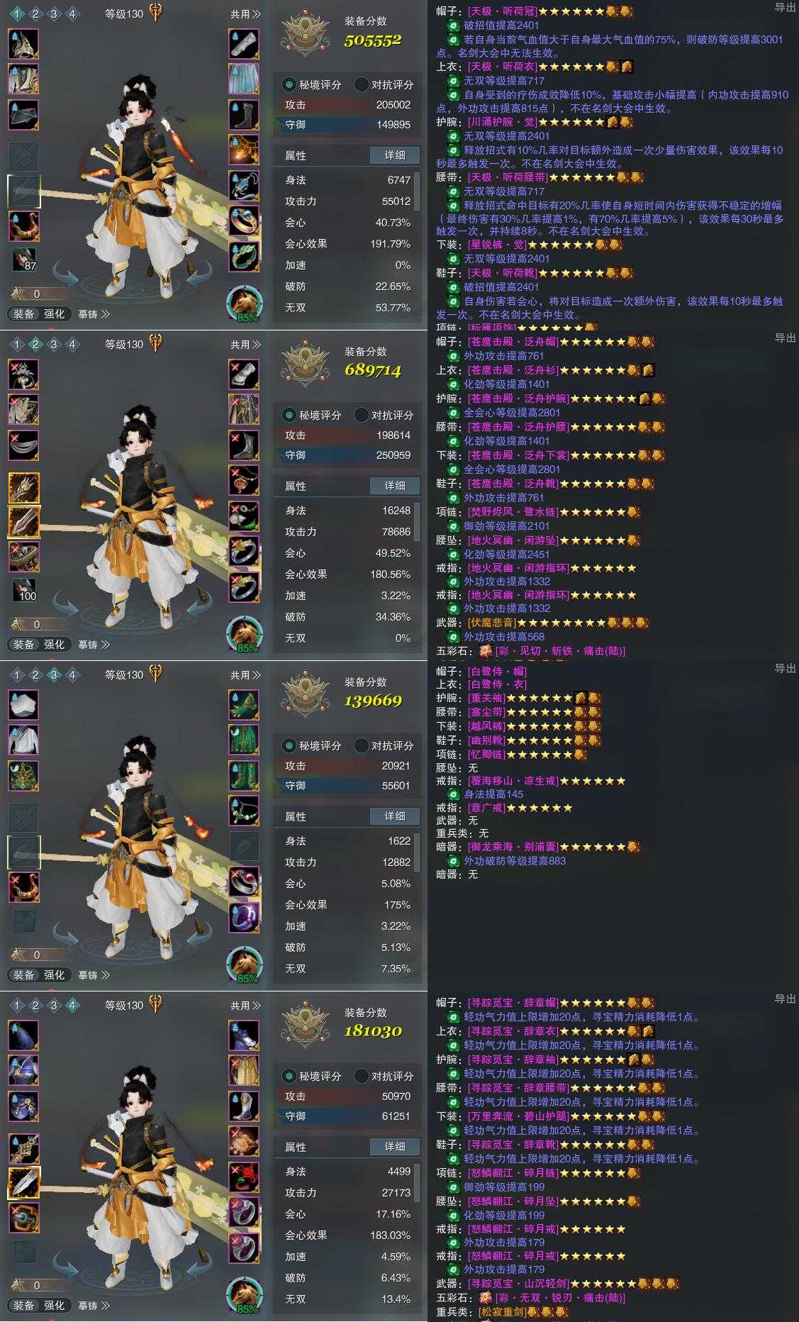 【装备】130级,山居剑意/问水诀PVE505552,山居剑意/问水诀PVP689714,装备三139669,装备四181030