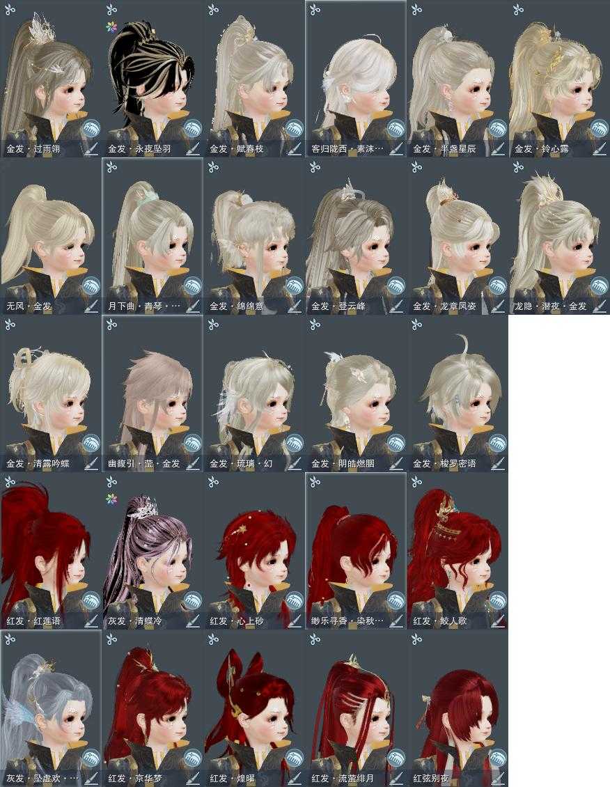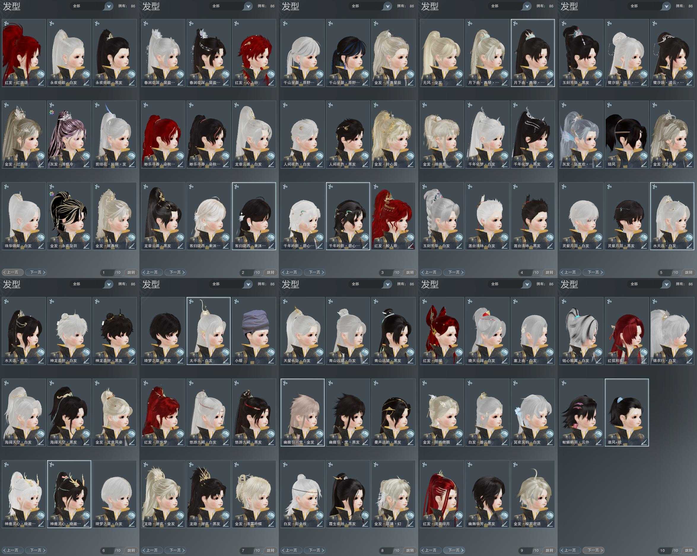 【发型】金发17个[资历金, 双十二金发, 海金, 水母金, 龙金, 三代金, 咩金, 铃金, 无风金发, 精灵金, 蛇金, 永夜金, 翎金, 白幽馥金发, 黑龙隐金发, 蓝月下金发, 蓝陇西金发], 红发10个[蝶粉, 鸡红, 兔红, 小资历红, 龙红, 十五红, 蛇红, 红寻香红发, 十六红, 三代灰金], 黑发29个, 白发29个, 盒子发型[白幽馥黑发, 青山盒黑发, 黑龙隐黑发, 游龙盒黑发, 青山盒白发, 婚纱盒黑发, 天星盒白发, 粉鹿黑发, 海阔盒黑发, 游龙盒白发, 熊猫黑发, 茄盒黑发, 婚纱盒白发, 粉鹭黑发, 粉鹿白发, 莲台盒黑发, 梦盒黑发, 海阔盒白发, 熊猫白发, 蓝月下黑发, 茄盒白发, 青蛇盒黑发, 粉鹭白发, 莲台盒白发, 梦盒白发, 人间夜色黑发, 青蛇盒白发, 蓝千山黑发, 蓝陇西黑发, 人间夜色白发, 墨龙盒黑发, 红寻香黑发, 蓝千山白发, 蓝蝴蝶黑发, 墨龙盒白发, 蓝蝴蝶白发, 傀儡黑发, 傀儡白发], 总页数10