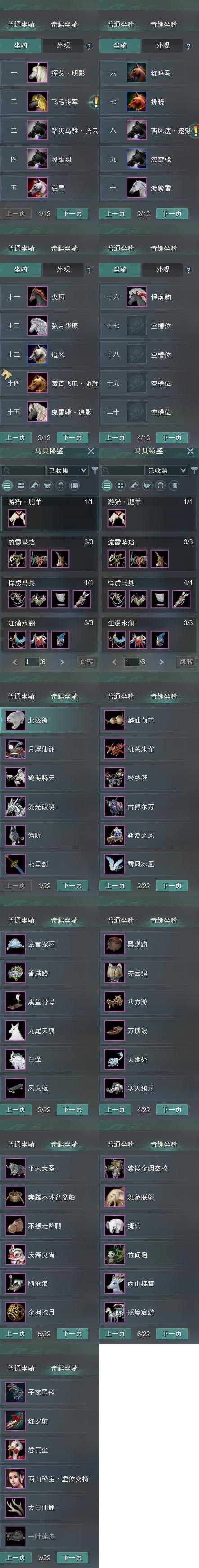 【坐骑】16个[踏炎腾云, 西风瘦逐狱, 飞毛将军, 弦月马, 挥戈明影, 曳霄骥追影, 雷首飞电驰辉]