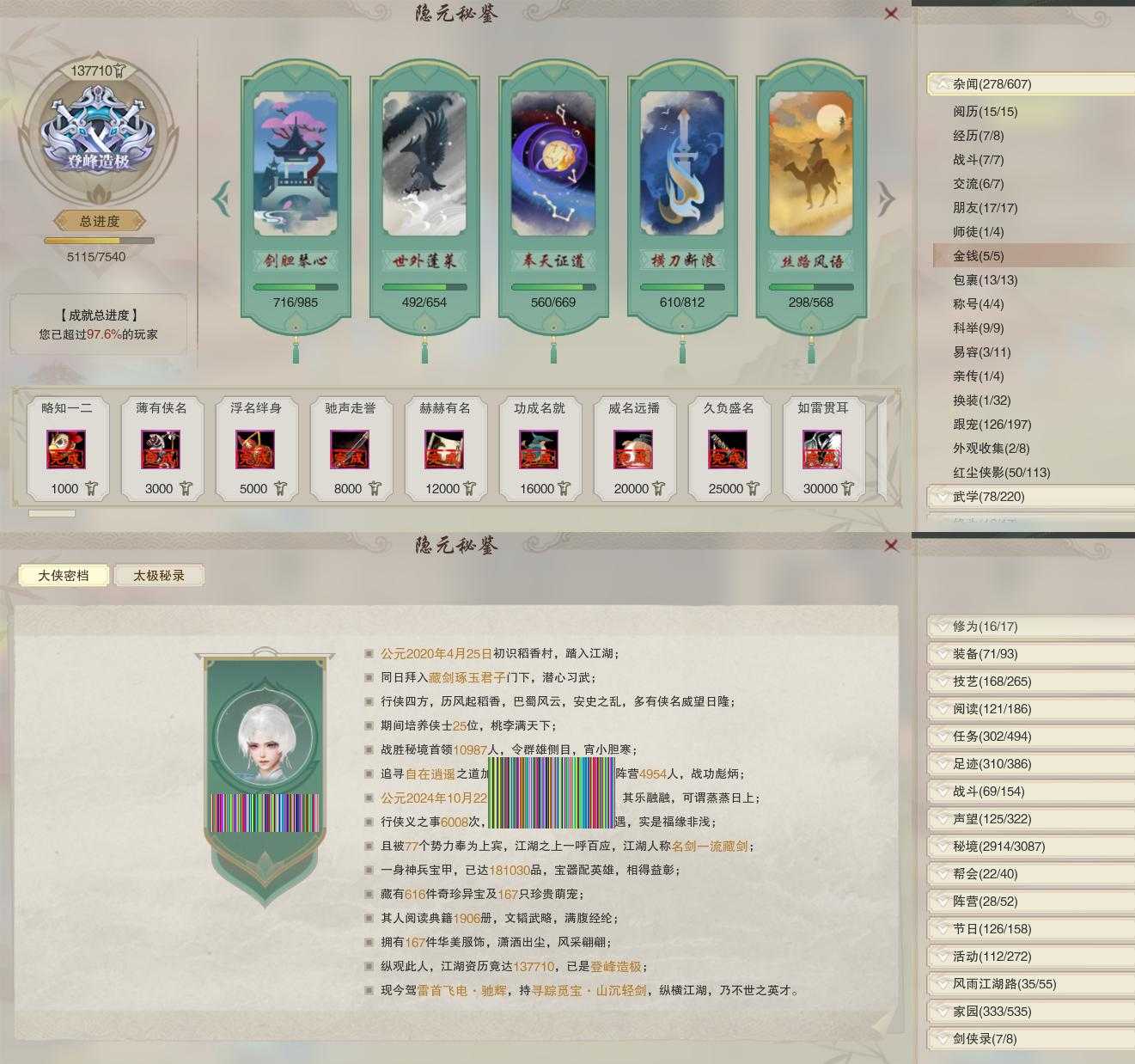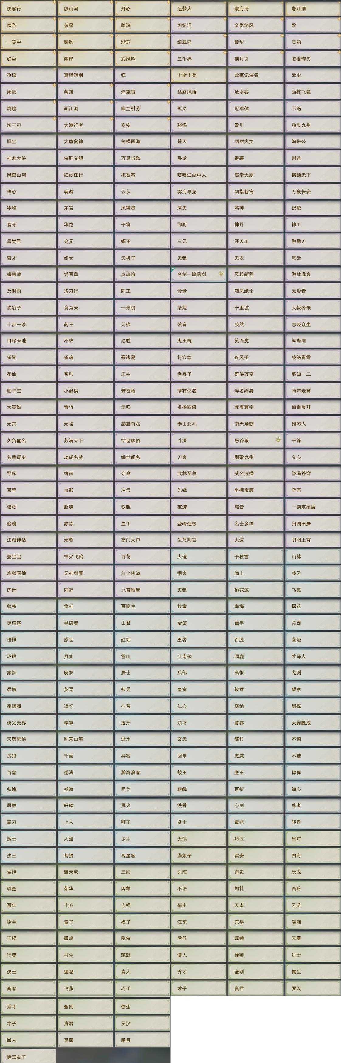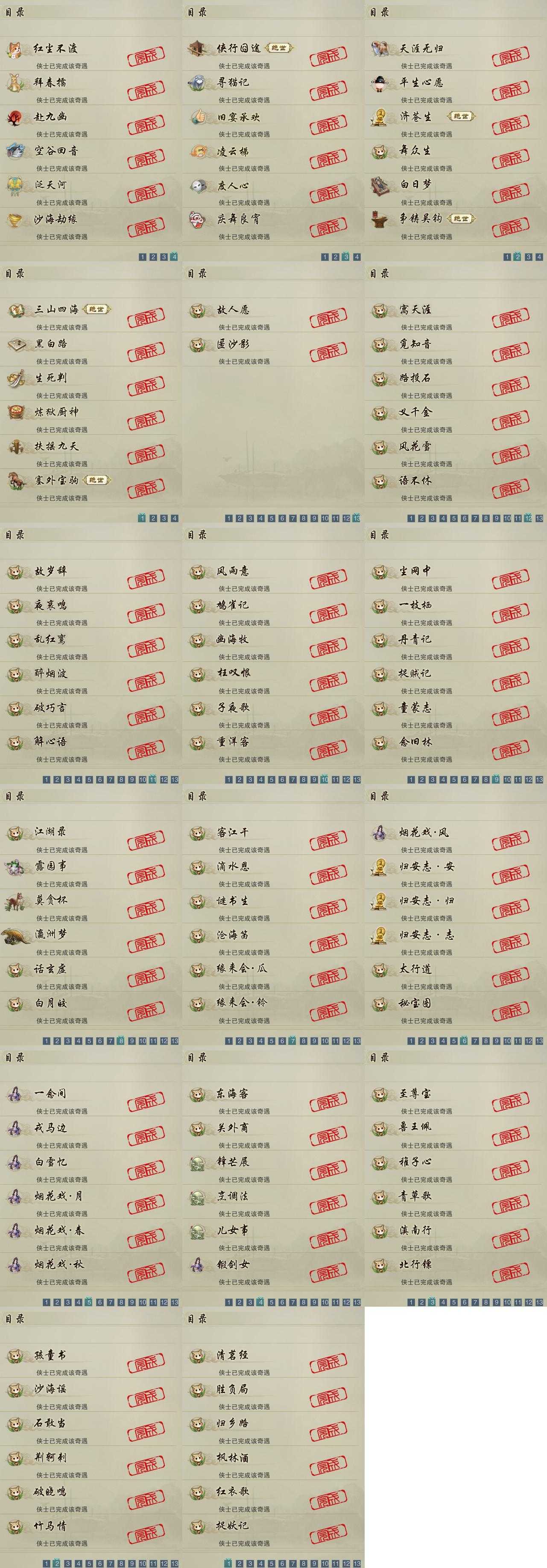 【奇遇】24个[天涯无归, 白日梦, 三山四海, 平生心愿, 黑白路, 塞外宝驹, 争铸吴钩, 济苍生, 扶摇九天, 舞众生, 侠行囧途, 寻猫记, 庆舞良宵, 生死判, 凌云梯, 炼狱厨神, 赴九幽, 度人心, 空谷回音, 旧宴承欢, 泛天河, 红尘不渡, 拜春擂, 沙海劫缘]