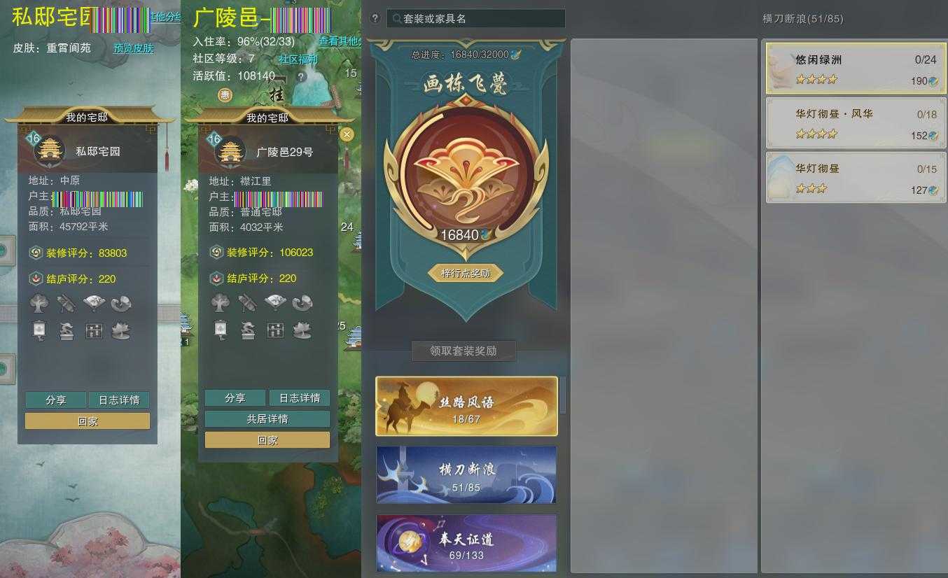 【家园】房屋等级16,社区等级7,私邸宅园,梓行点16840