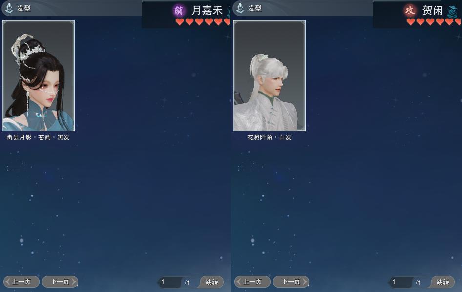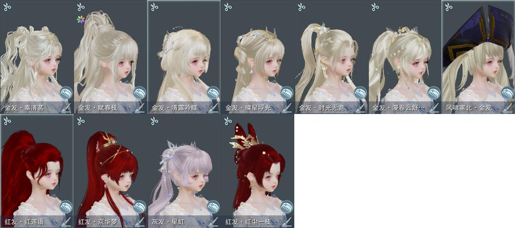 【发型】金发7个[时光金, 独孤九金, 云金, 雪金, 水母金, 蛇金, 金发奉清茗], 红发4个[十二红, 龙红, 十六红, 二代灰], 黑发21个, 白发11个, 盒子发型[十二黑, 蓝海岛黑发, 竹影梦境黑发, 山海黑发, 山海白发, 绿幽昙黑发, 幽涧愀兮白发, 蓝钻石盒黑发, 蓝椿山黑发, 踏青黑发, 蓝钻石盒白发, 蓝兔盒黑发, 踏青白发, 蓝兔盒白发, 天星盒黑发, 天星盒白发, 蓝观灯盒黑发, 熊猫黑发, 白鹭黑发, 兰陵盒黑发, 海阔盒白发, 熊猫白发, 蓝蝴蝶黑发, 傀儡黑发, 白浮光黑发, 魔镜黑发, 魔镜盒白发], 总页数5