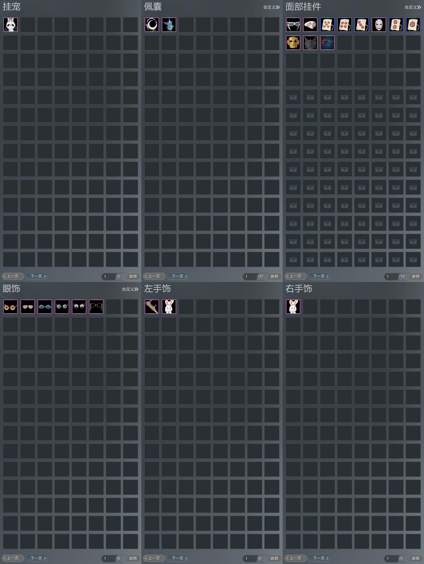 盒子:[蓝海岛(标), 灰竹影(标), 山神盒, 蓝钻盒, 踏青盒, 蓝兔盒, 绿幽昙(标), 蓝椿山盒(标), 天星盒, 海阔盒(缺黑发), 熊猫盒, 魔镜盒(缺背挂)]