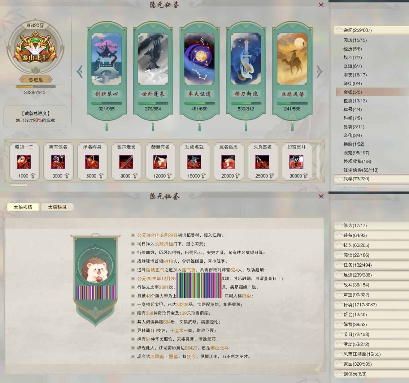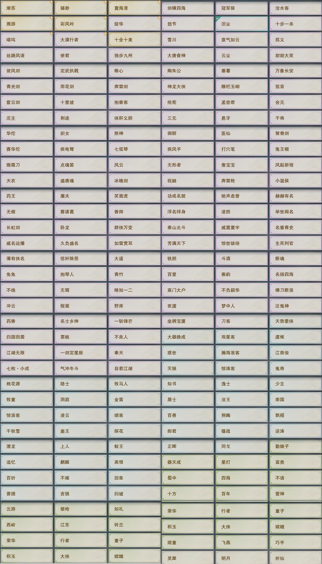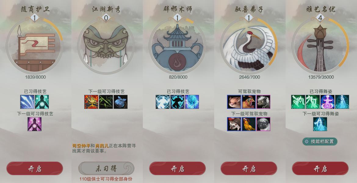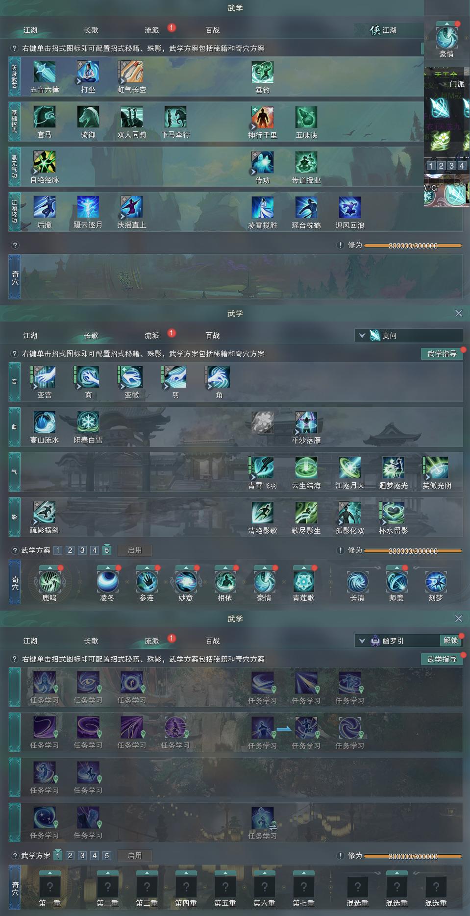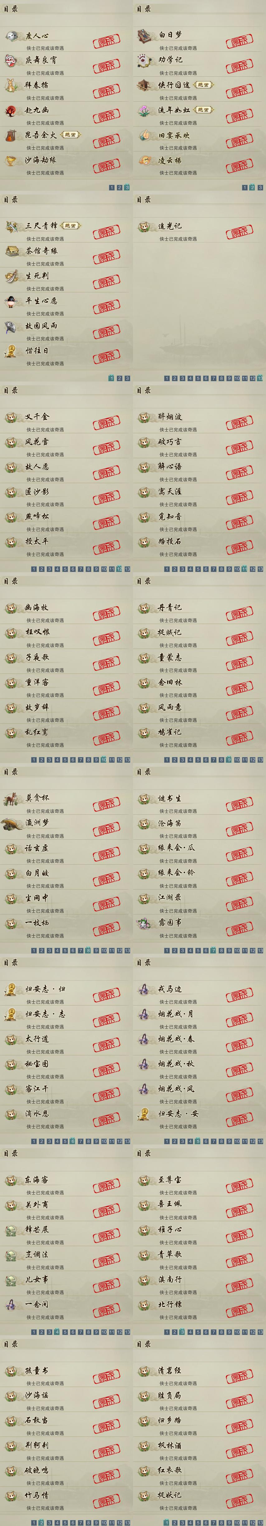 【奇遇】18个[白日梦, 劝学记, 平生心愿, 惜往日, 三尺青锋, 故园风雨, 流年如虹, 侠行囧途, 茶馆奇缘, 庆舞良宵, 生死判, 凌云梯, 度人心, 赴九幽, 旧宴承欢, 昆吾余火, 拜春擂, 沙海劫缘]
