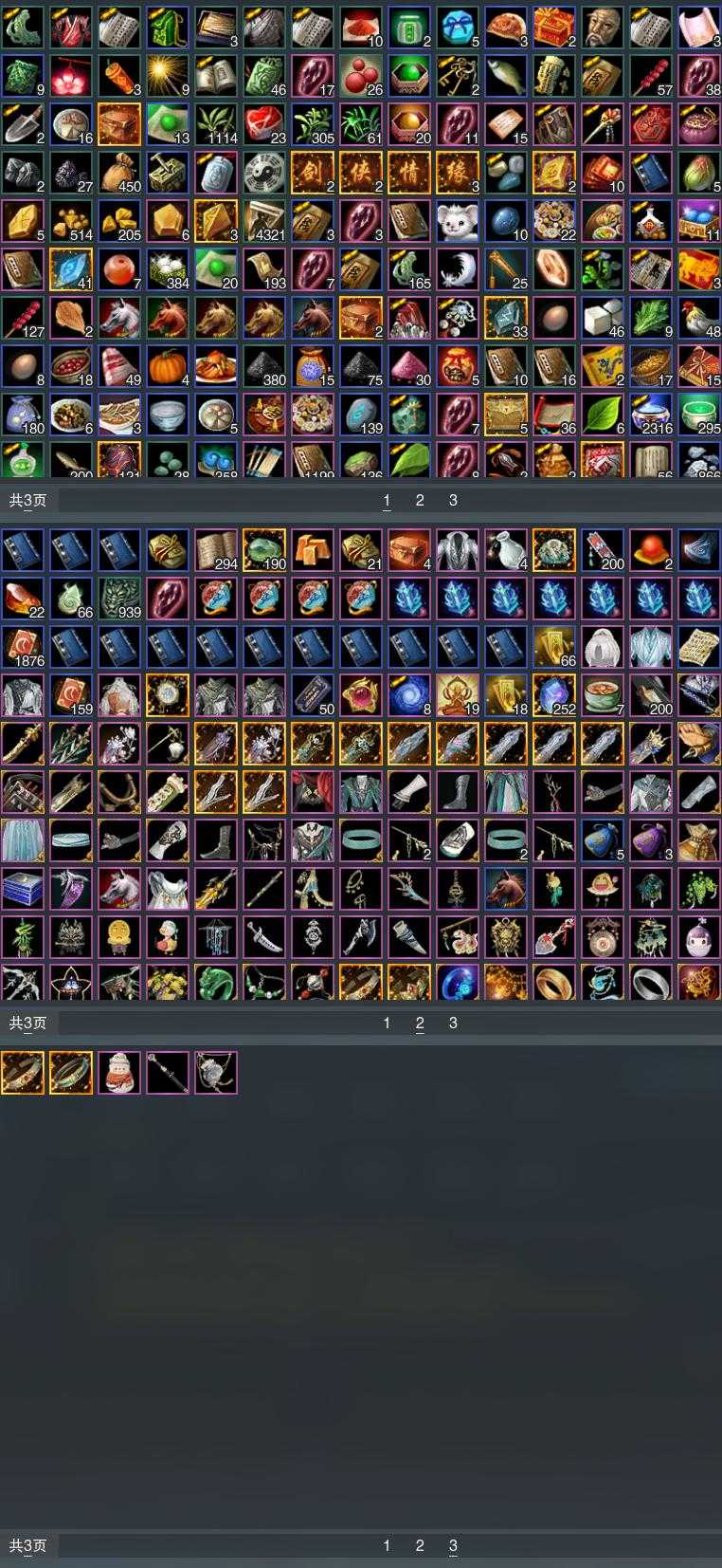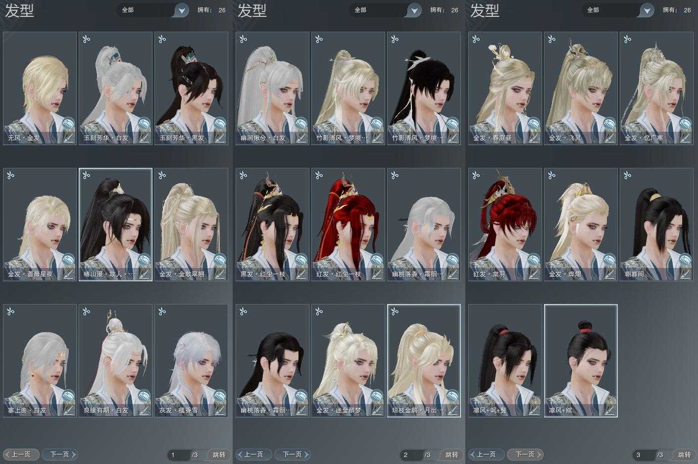 【发型】金发10个[兔金, 鼠金, 猪金, 飒金, 牛金, 四代中秋金, 蔷薇金, 无风金发, 澄琼枝金发, 竹影梦境金发], 红发3个[十红, 十二红, 一代灰], 黑发6个, 白发5个, 盒子发型[紫幽香黑发, 紫幽香白发, 十二黑, 竹影梦境黑发, 七七白发, 幽涧愀兮白发, 黑椿山黑发], 总页数3