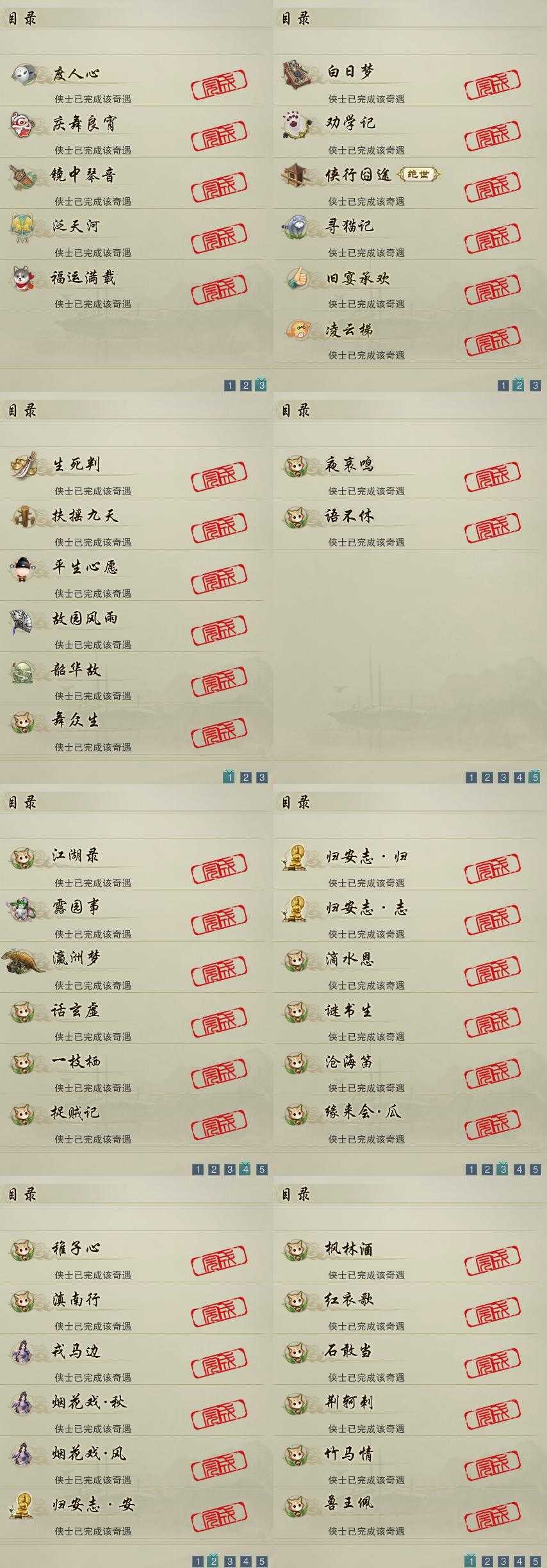 【奇遇】17个[白日梦, 劝学记, 平生心愿, 韶华故, 扶摇九天, 故园风雨, 舞众生, 侠行囧途, 寻猫记, 庆舞良宵, 生死判, 凌云梯, 度人心, 旧宴承欢, 镜中琴音, 泛天河, 福运满载]