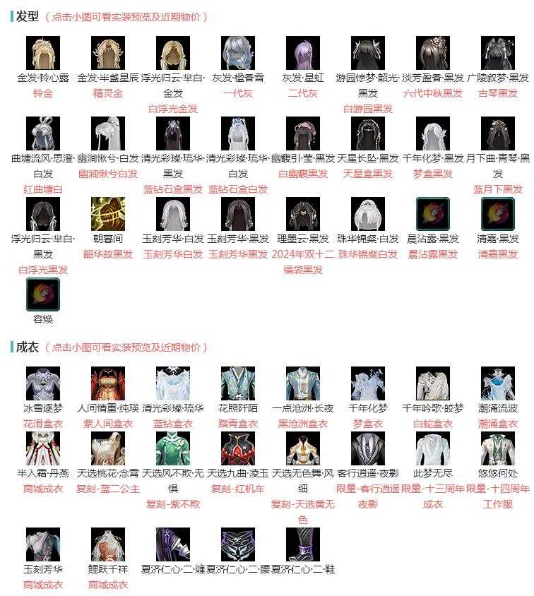 注:手写文字难免有误,盒子默认指有衣服,文字各部件详情仅做参考,官方四体型存在对应外观颜色各不一致问题;单出角色只有角色,积分等归属原帐号;