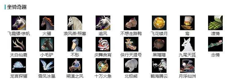 【奇趣】14个[雪凤冰凰, 飞花镂月, 鸾, 渡情, 太白仙鹿, 小毛驴, 不愁, 不想走路鸭, 黑蹭蹭, 九尾天狐]