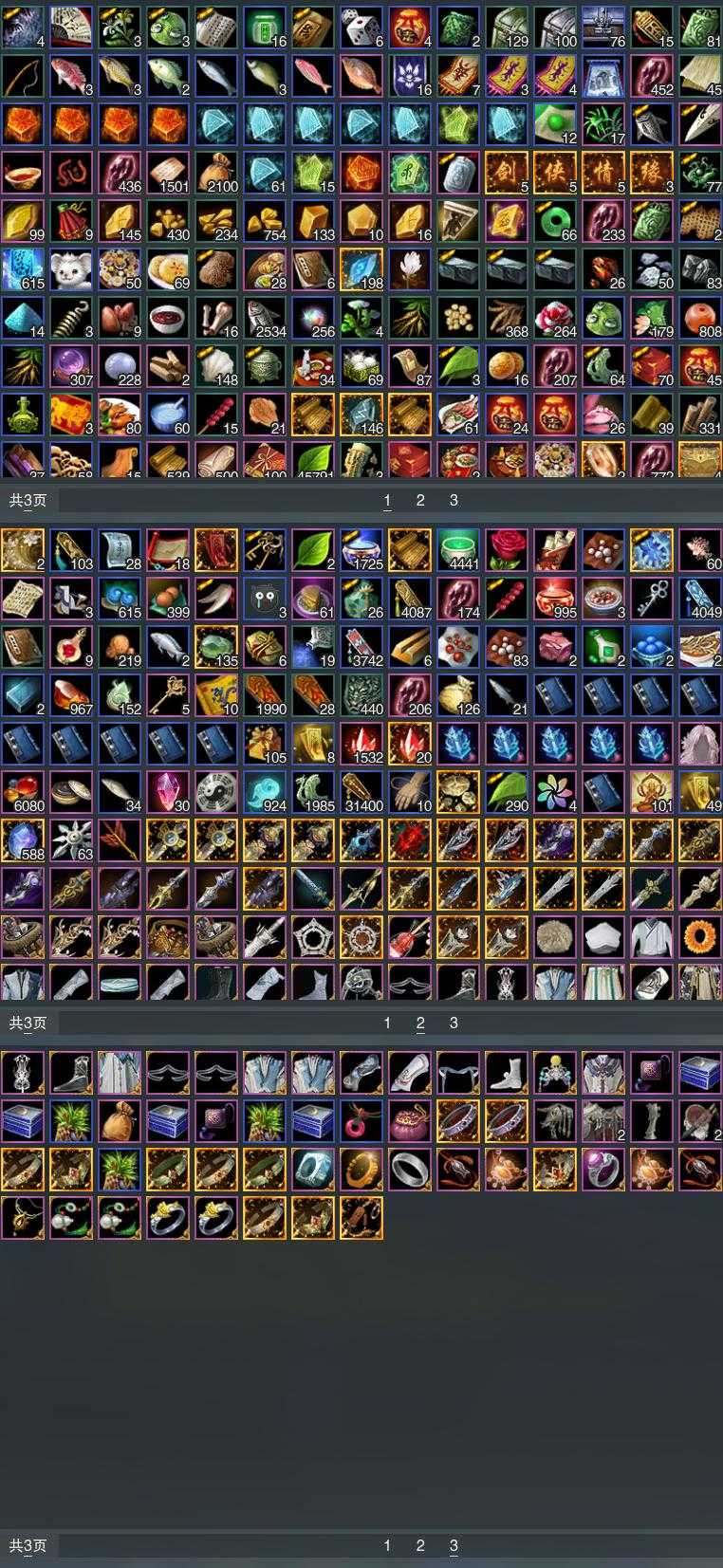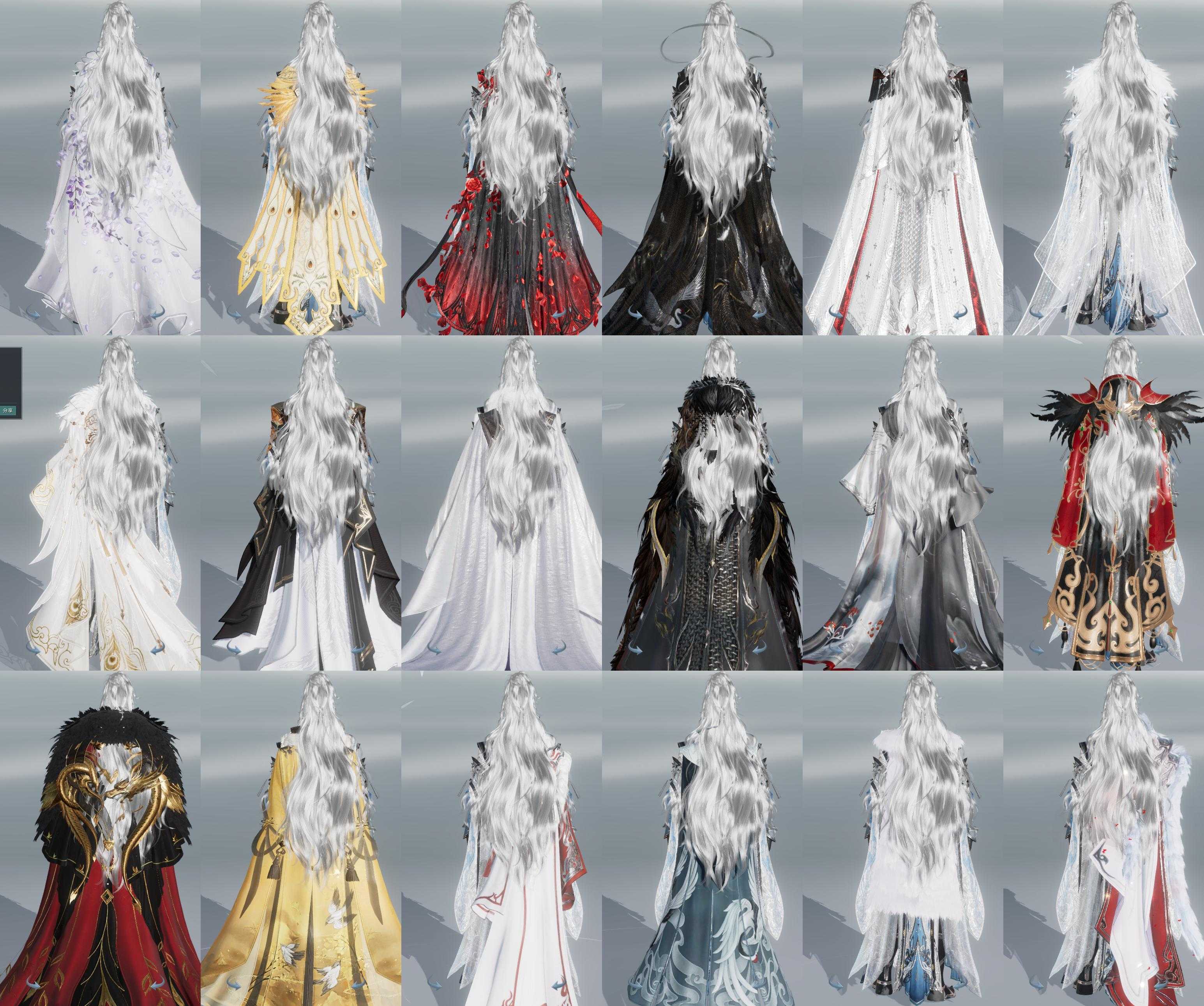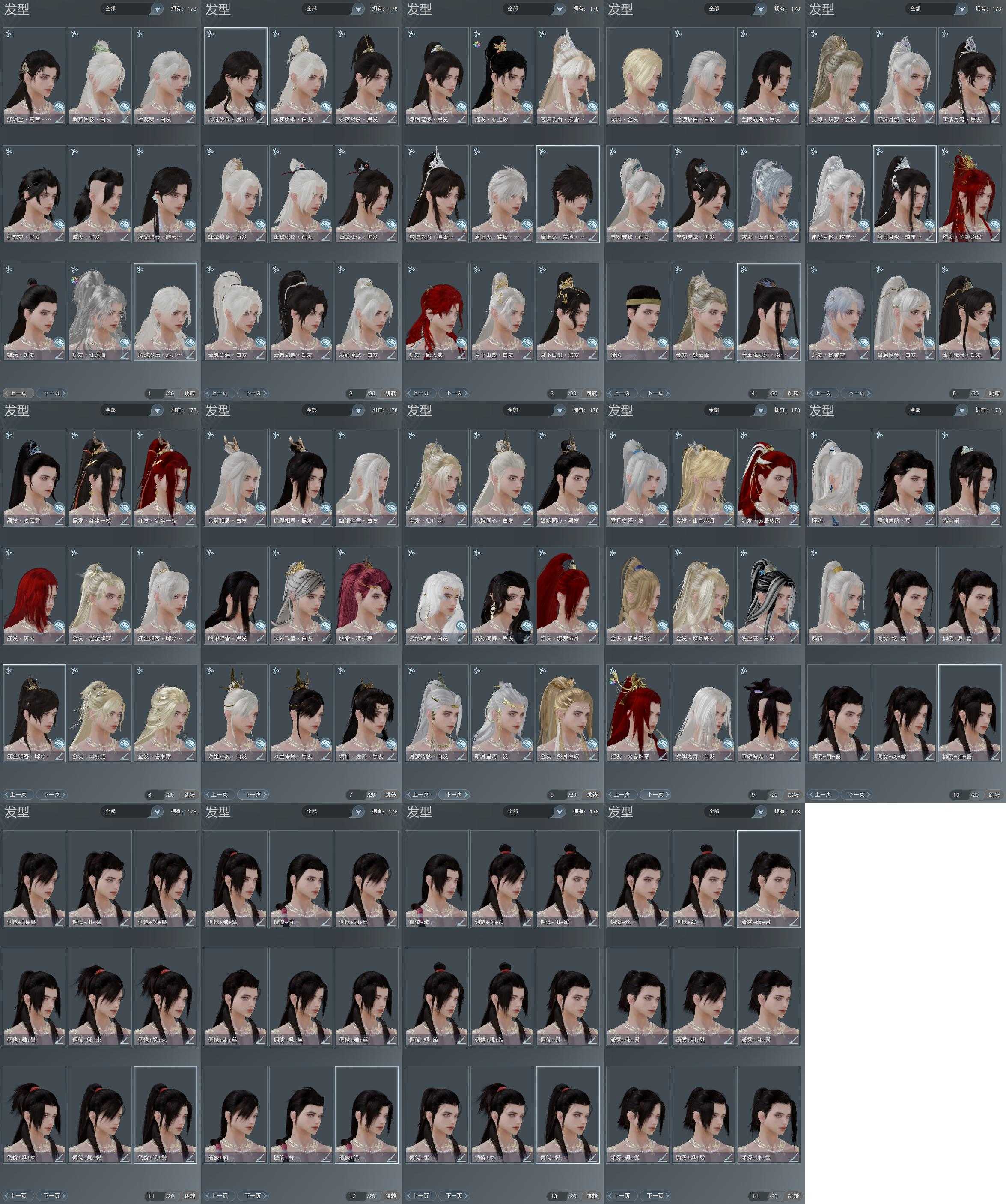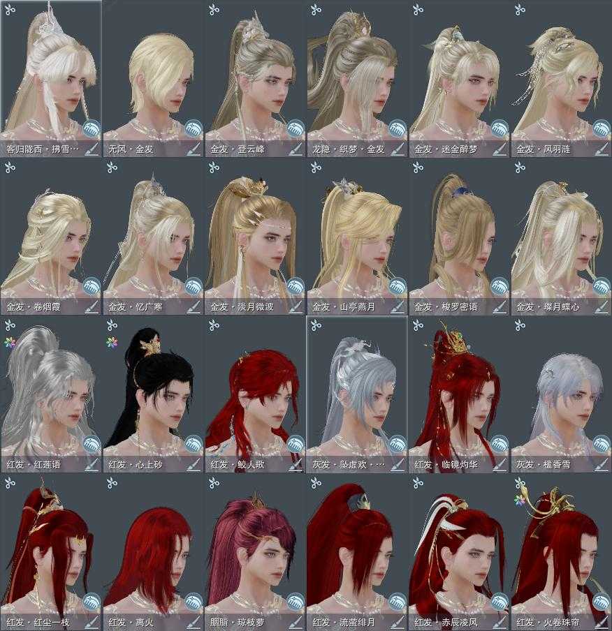 【发型】金发12个[狐金, 兔金, 资历金, 国金, 倒闭金, 角金, 凤金, 牛金, 三代金, 无风金发, 白龙隐金发, 白陇西金发], 红发12个[六红, 八红, 十二红, 十三红, 紫发, 小资历红, 大资历红, 十五红, 蛇红, 十六红, 一代灰, 三代灰银], 黑发32个, 白发29个, 盒子发型[丝路黑, 四代七夕黑发, 白端午白发, 黑谪仙黑发, 三代中秋白, 乘风黑发, 雪月白发, 丝路白, 四代七夕白发, 幽阑黑发, 五代七夕黑发, 乘风白发, 飞皇白发, 幽阑白发, 五代七夕白发, 黑红尘黑发, 黑红尘白发, 十二黑, 白幽昙黑发, 幽涧愀兮白发, 白幽昙白发, 八七盒黑发, 八七盒白发, 蓝观灯盒黑发, 兰陵盒黑发, 九七黑发, 黑上火黑发, 兰陵盒白发, 九七白发, 黑上火白发, 白陇西黑发, 仙剑黑发, 潮涌盒黑发, 傀儡黑发, 仙剑白发, 潮涌盒白发, 蓝沙丘黑发, 傀儡白发, 蓝沙丘白发, 蓝浮光黑发, 涉烟尘玄宫黑发], 总页数14