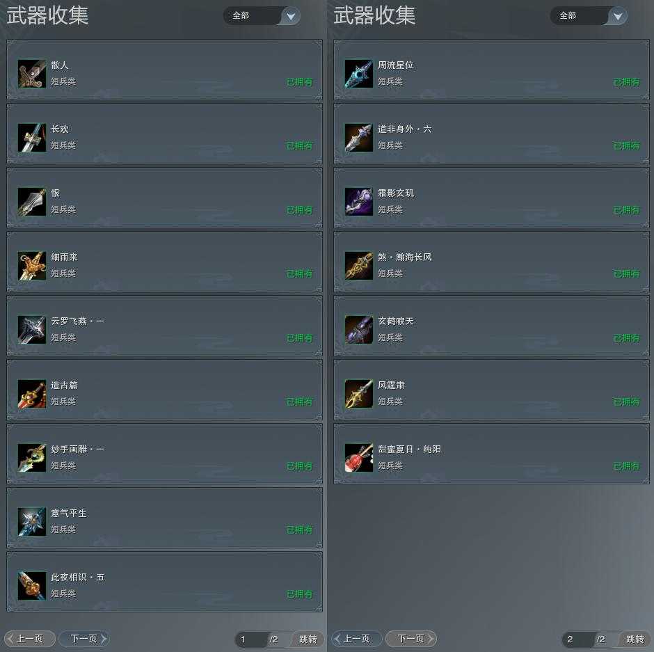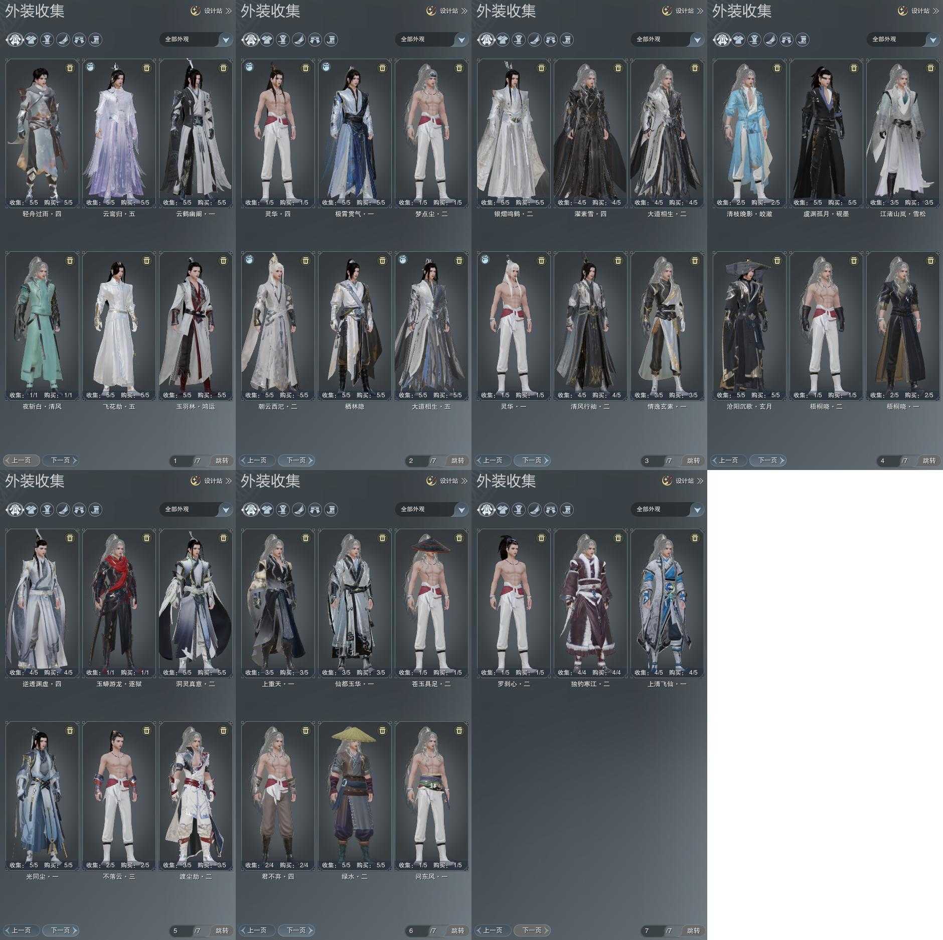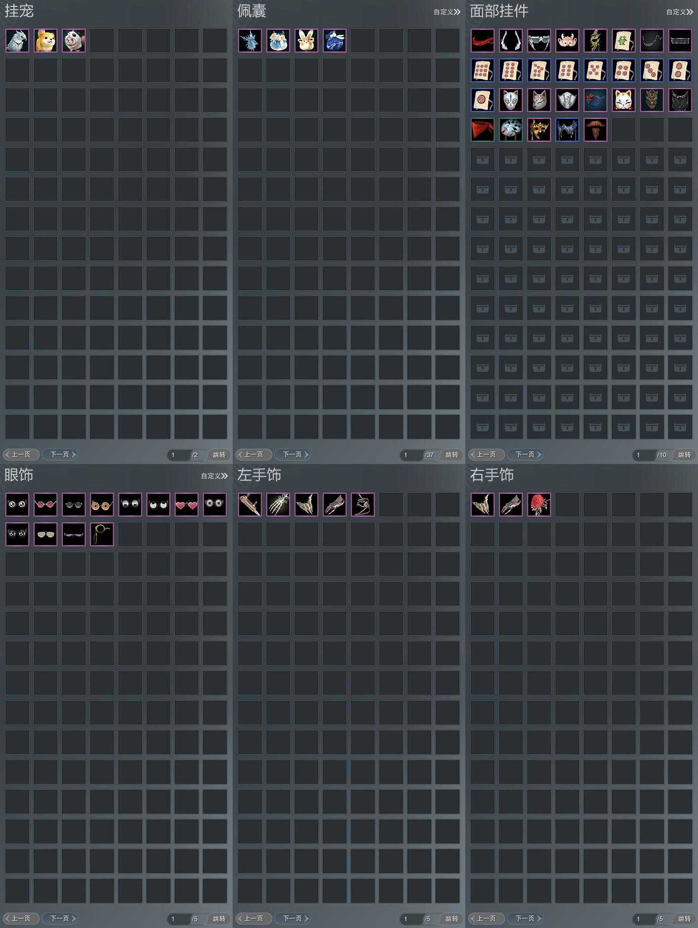 盒子:[黑盒, 丝路盒, 白端午盒(缺腰挂), 雪月盒, 叽盒, 秃盒, 红盒, 棋盒, 四代七夕盒, 五七盒, 一代乘风盒, 貂盒, 三中盒(缺背挂), 青盒, 黑四元盒, 咩盒, 白幽昙(标), 八七盒, 九七盒, 兰陵盒, 蓝观灯盒(标), 潮涌盒, 仙剑盒, 傀儡盒, 黑上火(豪), 白陇西(豪), 蓝沙丘(豪), 蓝浮光(标), 涉烟尘玄宫(标)]