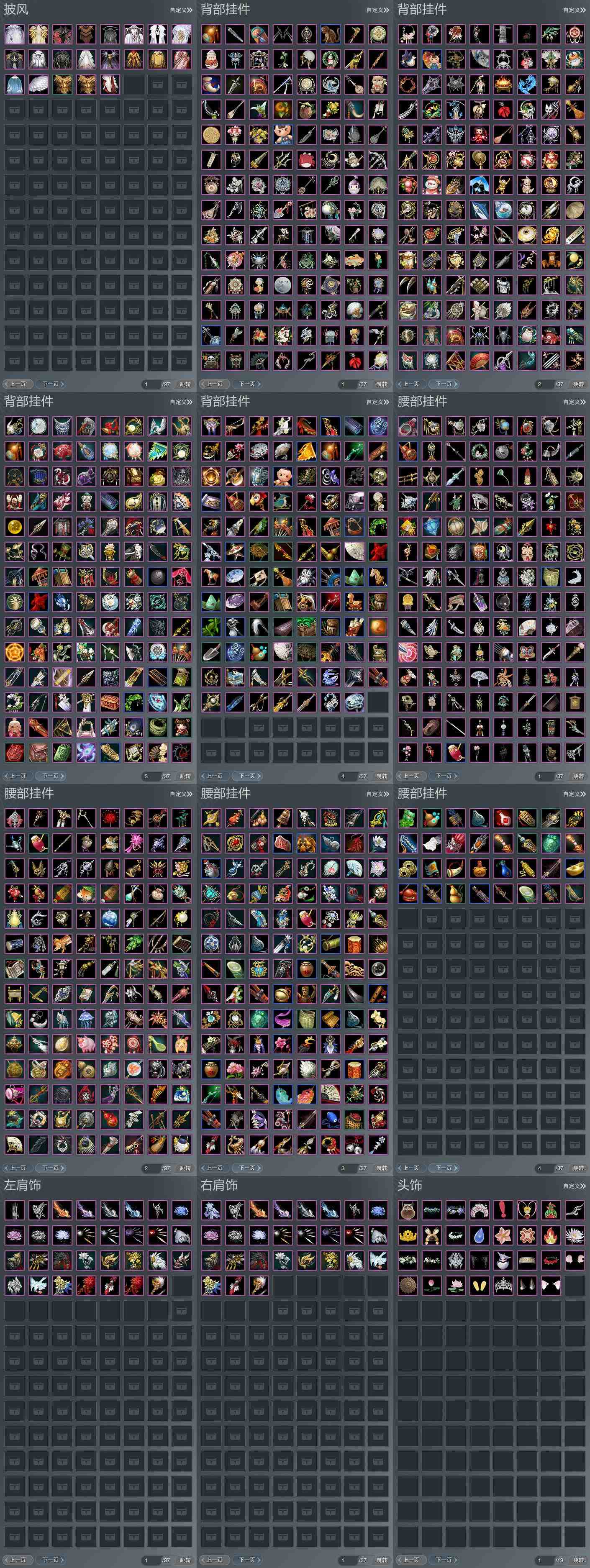 【肩饰】31左,27右,[栖鹤云归·左, 双鱼曳波·慧福·左, 双鱼曳波·如意·左, 双鱼曳波·无量·左, 双鱼曳波·极乐·左, 云旌望捷·左, 绝代仙·玉璃·左, 绝代仙·神姿·左, 绝代仙·墨楼·左, 绝代仙·千幻·左, 漱玉寒·奇彩·左, 漱玉寒·冰青·左, 漱玉寒·紫殿·左, 漱玉寒·火绸·左, 霜岱应元·左, 九阙天影·左, 浮屠明音·左, 盘龙凤舞·左, 剑歌惊月·左, 华焰披锦·左, 赤羽逍遥·左, 鹤影天青·左][栖鹤云归·右, 云旌望捷·右, 绝代仙·玉璃·右, 绝代仙·神姿·右, 绝代仙·墨楼·右, 绝代仙·千幻·右, 漱玉寒·奇彩·右, 漱玉寒·冰青·右, 漱玉寒·紫殿·右, 漱玉寒·火绸·右, 霜岱应元·右, 九阙天影·右, 浮屠明音·右, 盘龙凤舞·右, 剑歌惊月·右, 鹤影天青·右]