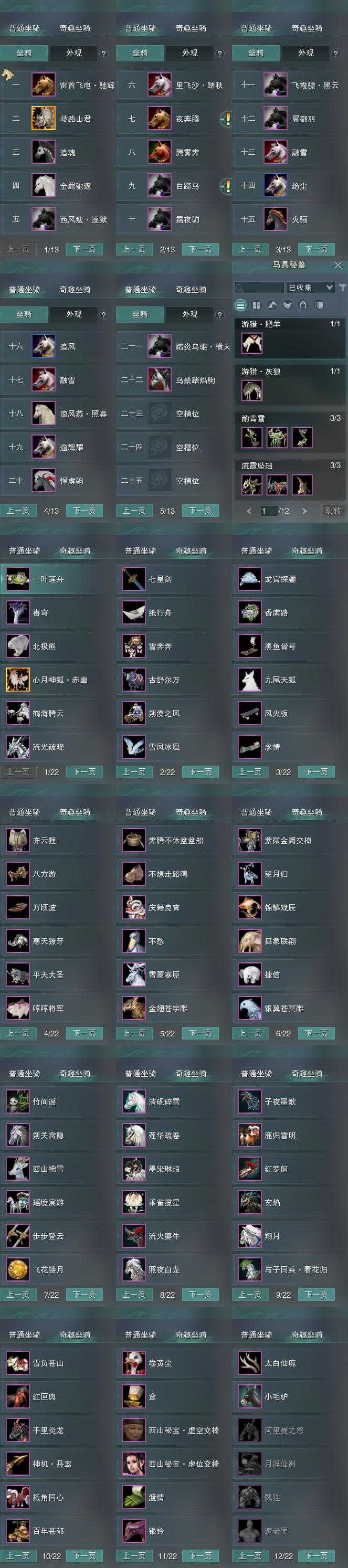 【坐骑】22个[绝尘, 踏炎横天, 西风瘦逐狱, 飞霞骠黑云, 阵营白虎, 里飞沙踏秋, 金羁驰逐, 雷首飞电驰辉, 乌鬃踏焰驹]