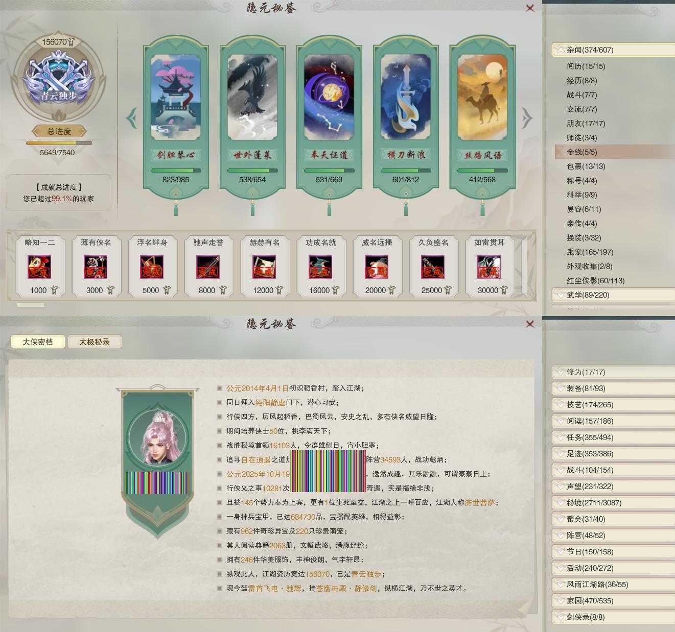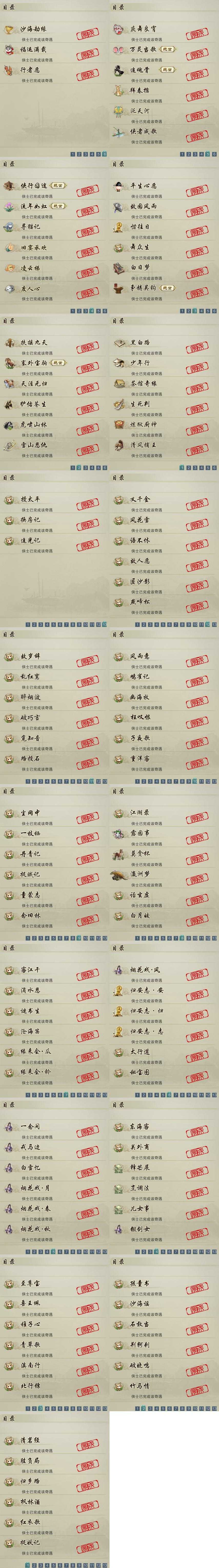 【奇遇】32个[白日梦, 天涯无归, 雪山恩仇, 平生心愿, 黑白路, 惜往日, 塞外宝驹, 争铸吴钩, 虎啸山林, 护佑苍生, 少年行, 故园风雨, 扶摇九天, 流年如虹, 舞众生, 清风捕王, 侠行囧途, 寻猫记, 茶馆奇缘, 庆舞良宵, 万灵当歌, 生死判, 凌云梯, 炼狱厨神, 追魂骨, 度人心, 旧宴承欢, 泛天河, 侠者成歌, 沙海劫缘]