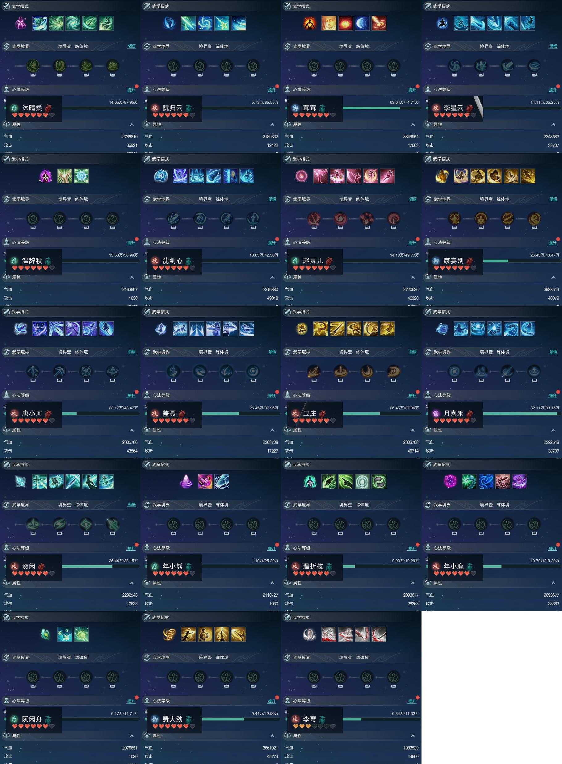 【同伴】沐晴柔84级境界壹,阮归云83级境界壹,茸茸志82级境界壹,李星云81级境界壹,温辞秋80级境界壹,沈剑心79级境界壹,赵灵儿79级境界壹,康宴别78级境界壹,唐小珂78级境界壹,盖聂77级境界壹,卫庄77级境界壹,月嘉禾76级境界壹,贺闲76级境界壹,年小熊74级境界壹,温折枝72级境界壹,年小鹿72级境界壹,阮闲舟70级境界壹,费大劲69级境界壹,李萼志68级境界壹