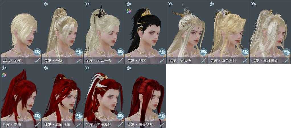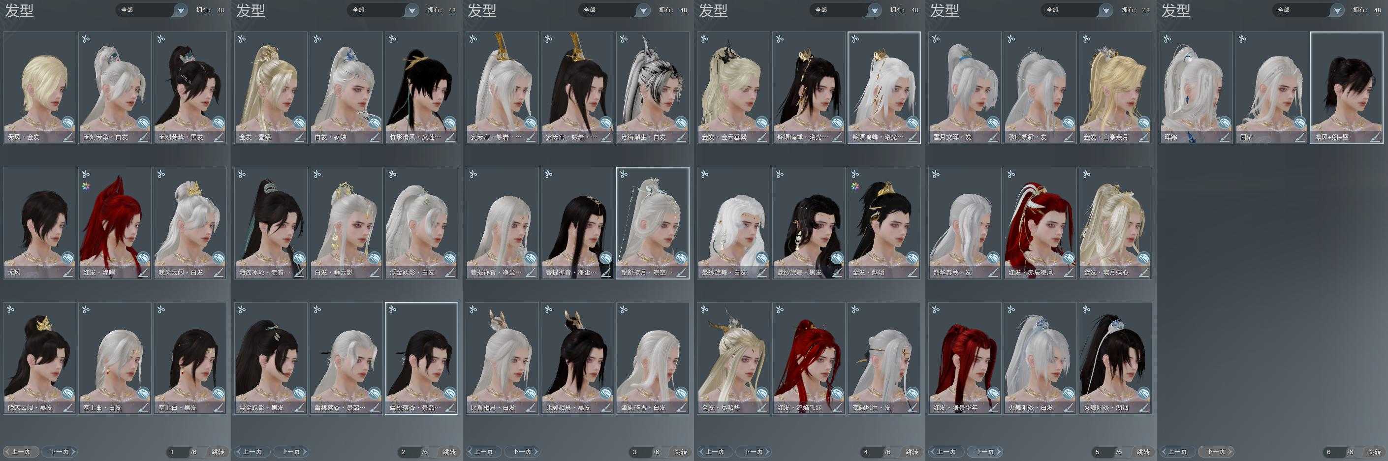 【发型】金发7个[狐金, 中秋金, 国金, 猪金, 苍金, 虎金, 无风金发], 红发4个[八红, 九红, 猴红, 兔红], 黑发14个, 白发22个, 盒子发型[丝路黑, 二代七夕白, 一代重阳白, 黑端午白发, 雪月白发, 白楼兰黑发, 丝路白, 五代七夕黑发, 白楼兰白发, 净尘黑发, 幽阑白发, 五代七夕白发, 绿中秋白发, 净尘白发, 黑狮黑发, 蓝幽香黑发, 沧海白发, 小金龙黑发, 黑狮白发, 蓝幽香白发, 小金龙白发, 蓝海岛黑发, 竹影火莲黑发], 总页数6