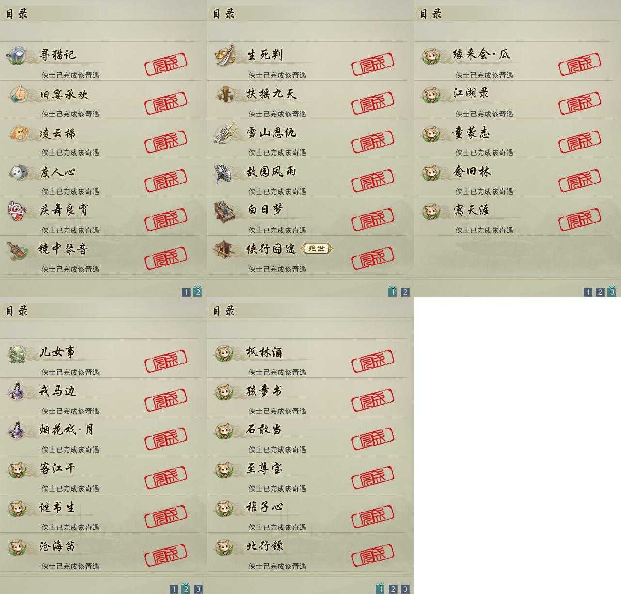 【奇遇】12个[白日梦, 雪山恩仇, 扶摇九天, 故园风雨, 寻猫记, 侠行囧途, 庆舞良宵, 生死判, 凌云梯, 度人心, 旧宴承欢, 镜中琴音]