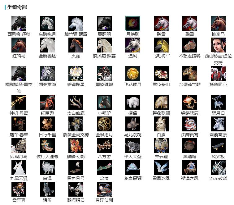 【奇趣】39个[雪凤冰凰, 西山秘宝·虚位交椅, 鲲鹏矮马·墨夜骓, 朔关雷隐, 乘雀揽星, 墨染琳琅, 飞花镂月, 雪负苍山, 金翅苍宇雕, 抵角同心]