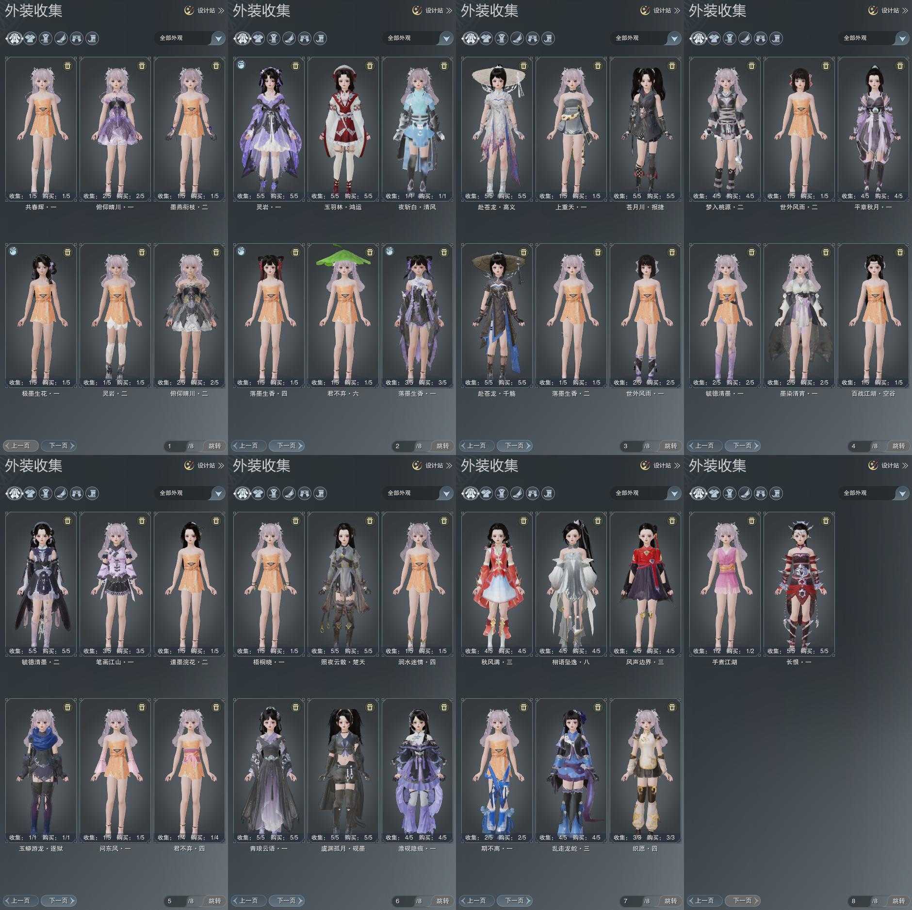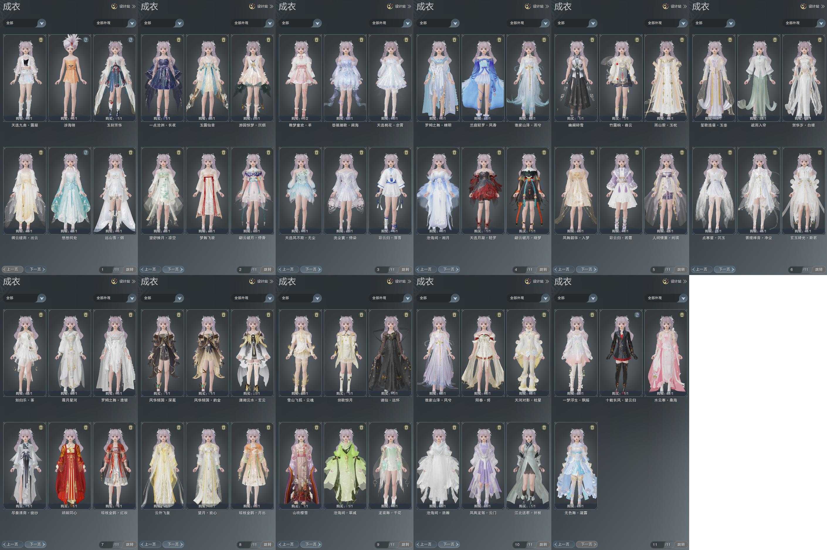 单盒成衣:[四代七夕衣, 黑谪仙衣, 白如归衣, 棋盒衣, 绿游园衣, 紫人间盒衣, 羊盒衣, 白雨山衣, 黑沧洲盒衣]