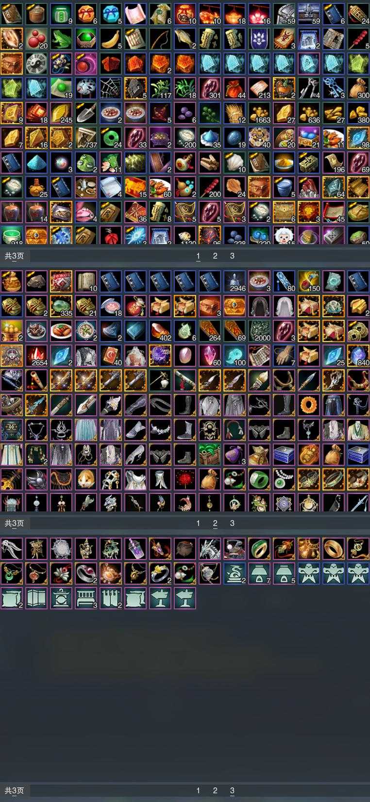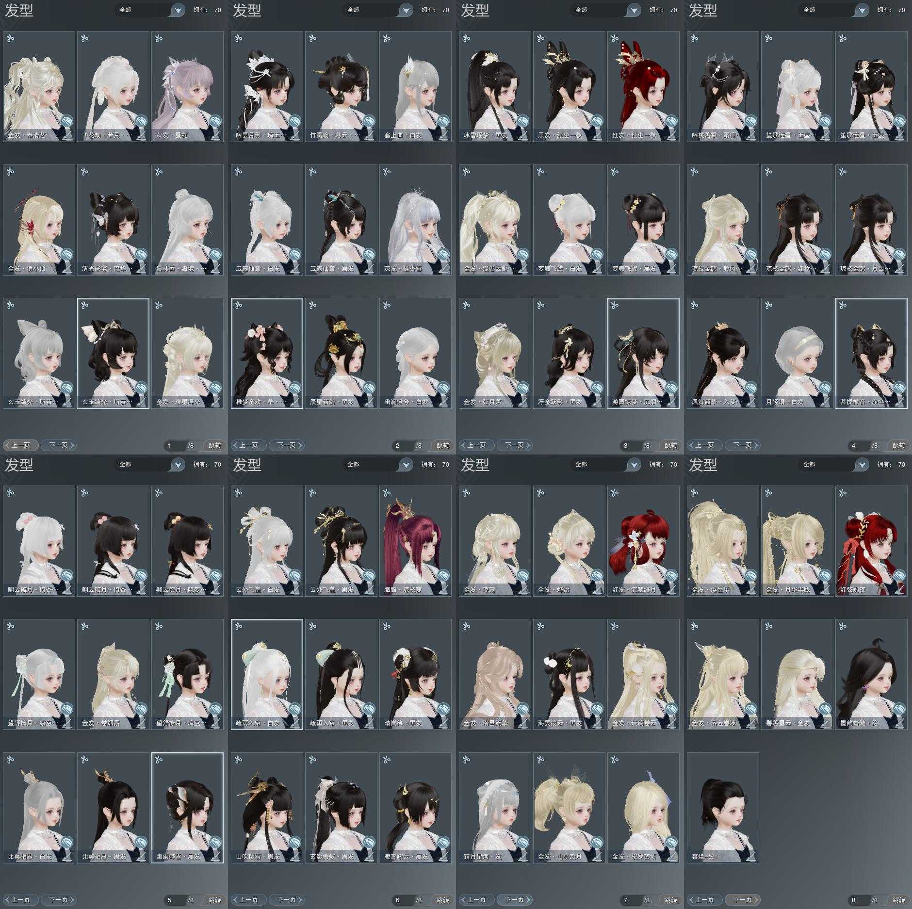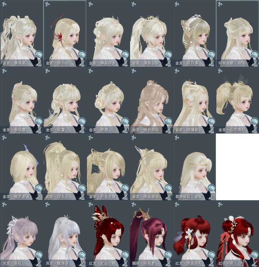 【发型】金发17个[资历金, 鸡金, 蝶金, 喵金, 国金, 苏金, 龙女金, 玫瑰金, 猪金, 珊瑚金, 角金, 巴卡金, 云金, 雪金, 刺金, 金发奉清茗, 白琼枝金发], 红发6个[十二红, 紫发, 鸡红, 小资历红, 二代灰, 一代灰], 黑发31个, 白发15个, 盒子发型[新绿中秋白发, 狄仁杰黑, 踏云黑发, 白端午白发, 小白龙黑发, 晴岚绘黑发, 山吹樱雪黑发, 澡盒黑发, 飞皇黑发, 幽阑黑发, 五代七夕黑发, 绿中秋黑发, 黑同人黑发, 粉同人黑发, 净尘黑发, 澡盒白发, 飞皇白发, 入梦黑发, 五代七夕白发, 澄琼枝黑发, 粉同人白发, 红琼枝黑发, 唐风玉壶黑发, 月轻语白发, 紫幽香黑发, 小金龙黑发, 唐风玉壶白发, 新绿游园黑, 小熊黑发, 十二黑, 小熊白发, 花滑黑发, 星辰黑发, 羊盒黑发, 山海黑发, 竹露响暮云黑发, 山海白发, 白幽昙黑发, 幽涧愀兮白发, 白玄玉黑发, 蓝钻石盒黑发, 白雪人白发, 黑傣族白发], 总页数8