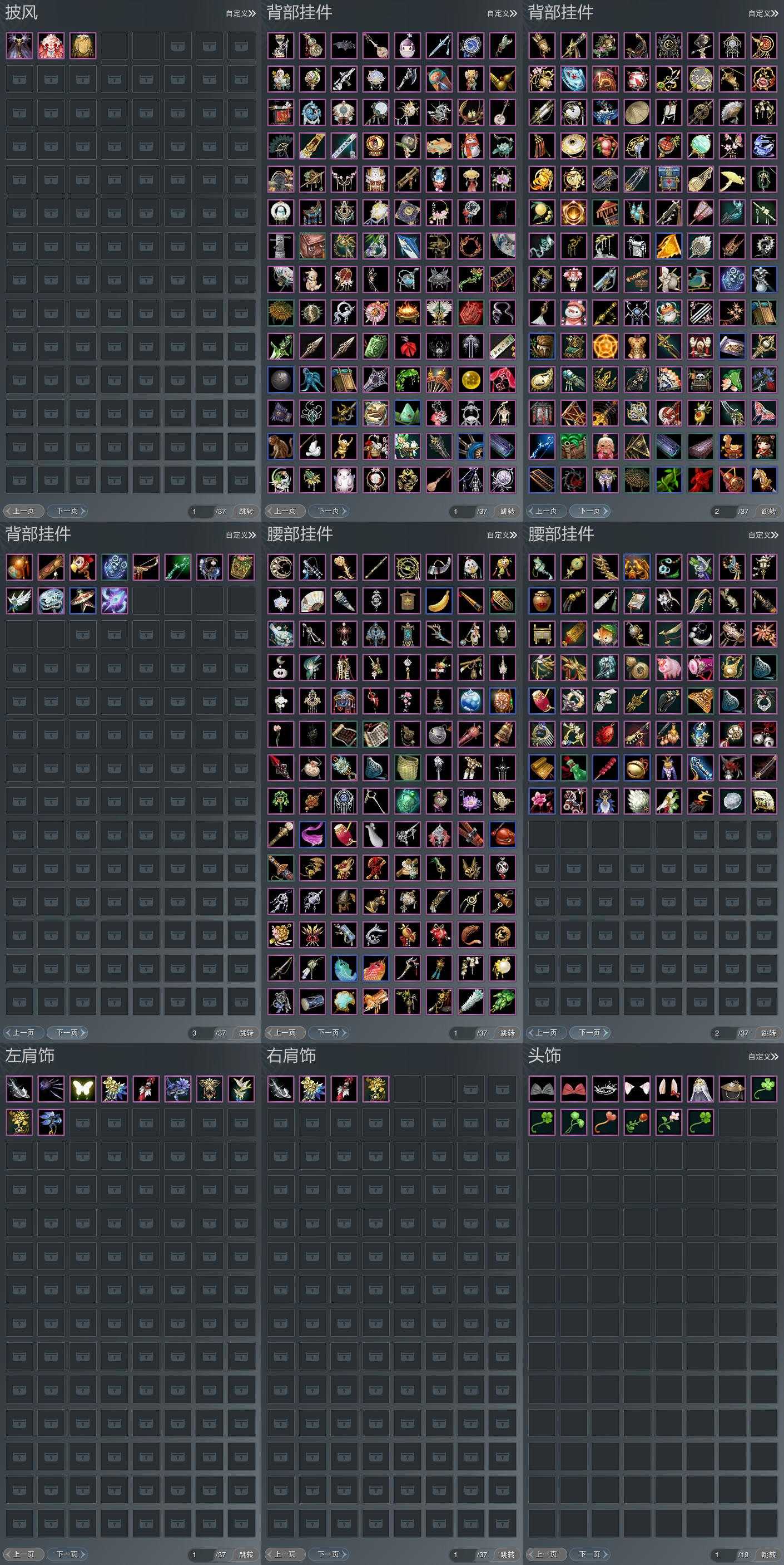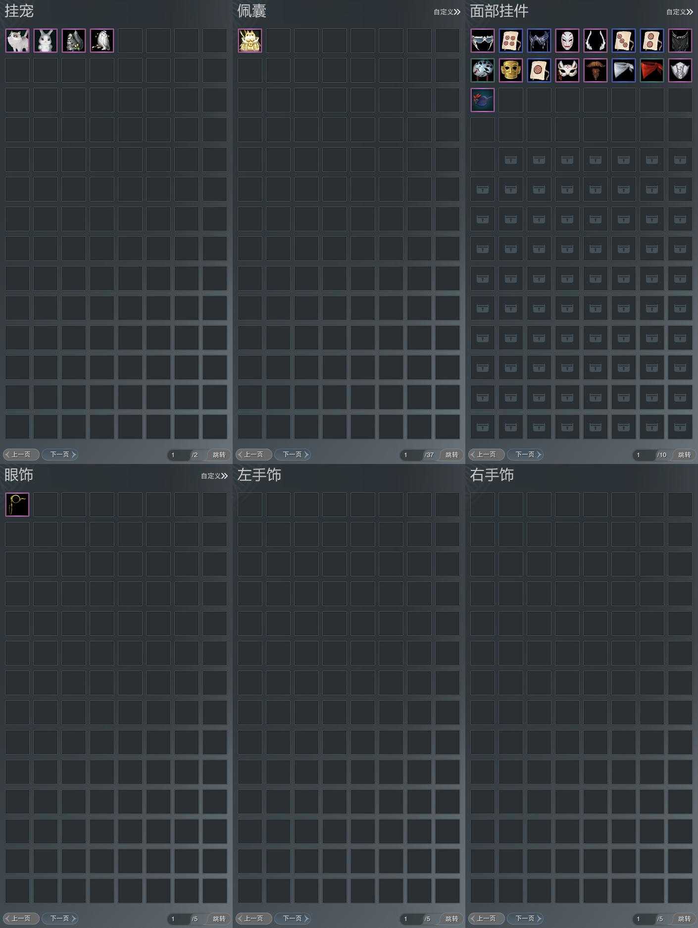 【肩饰】10左,4右,[双鱼曳波·无量·左, 漱玉寒·紫殿·左, 觅花踪·黄云·左, 剑歌惊月·左][剑歌惊月·右]