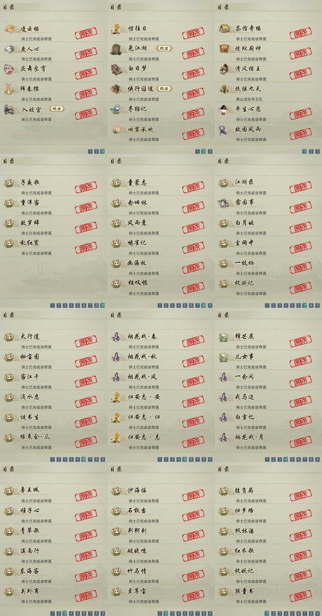 【奇遇】17个[白日梦, 兔江湖, 平生心愿, 惜往日, 扶摇九天, 故园风雨, 清风捕王, 侠行囧途, 寻猫记, 茶馆奇缘, 庆舞良宵, 入蛟宫, 凌云梯, 炼狱厨神, 度人心, 旧宴承欢, 拜春擂]