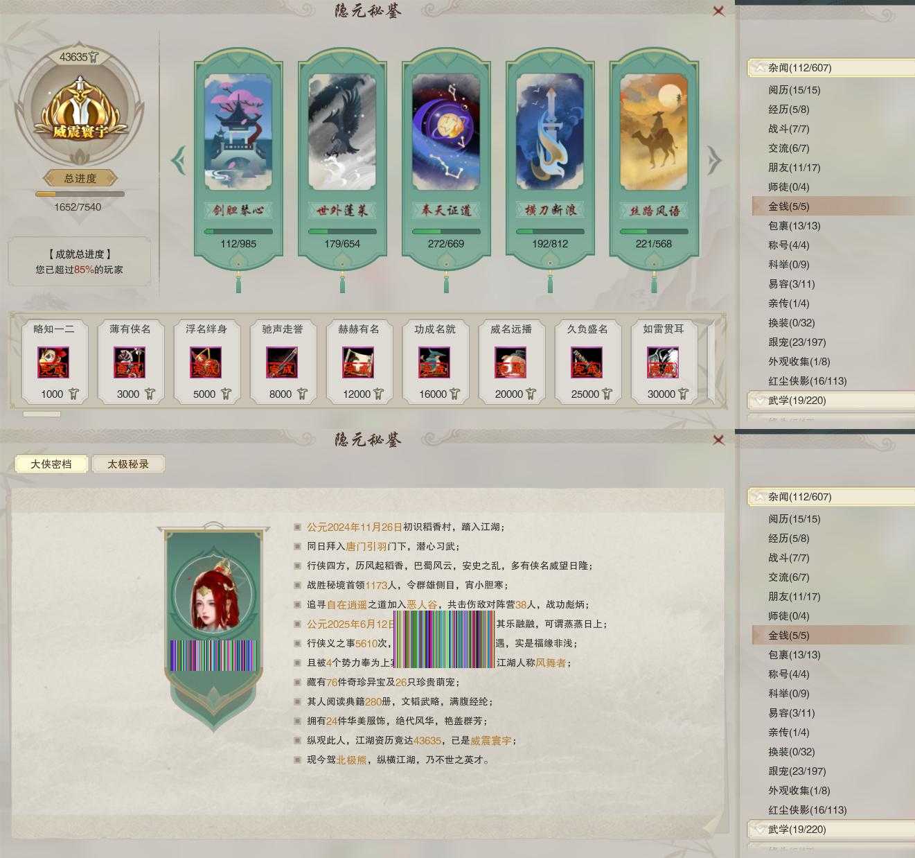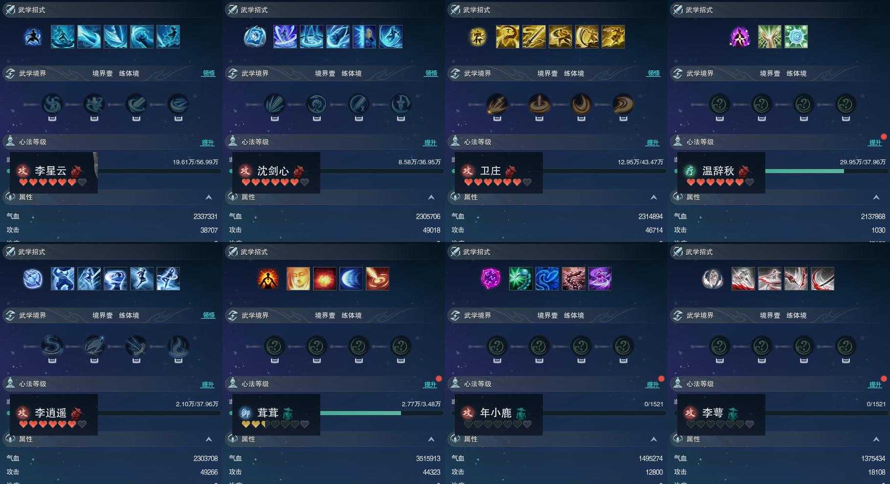 【同伴】李星云80级境界壹,沈剑心78级境界壹,卫庄78级境界壹,温辞秋77级境界壹,李逍遥77级境界壹,茸茸志59级境界壹,年小鹿1级境界壹,李萼志1级境界壹