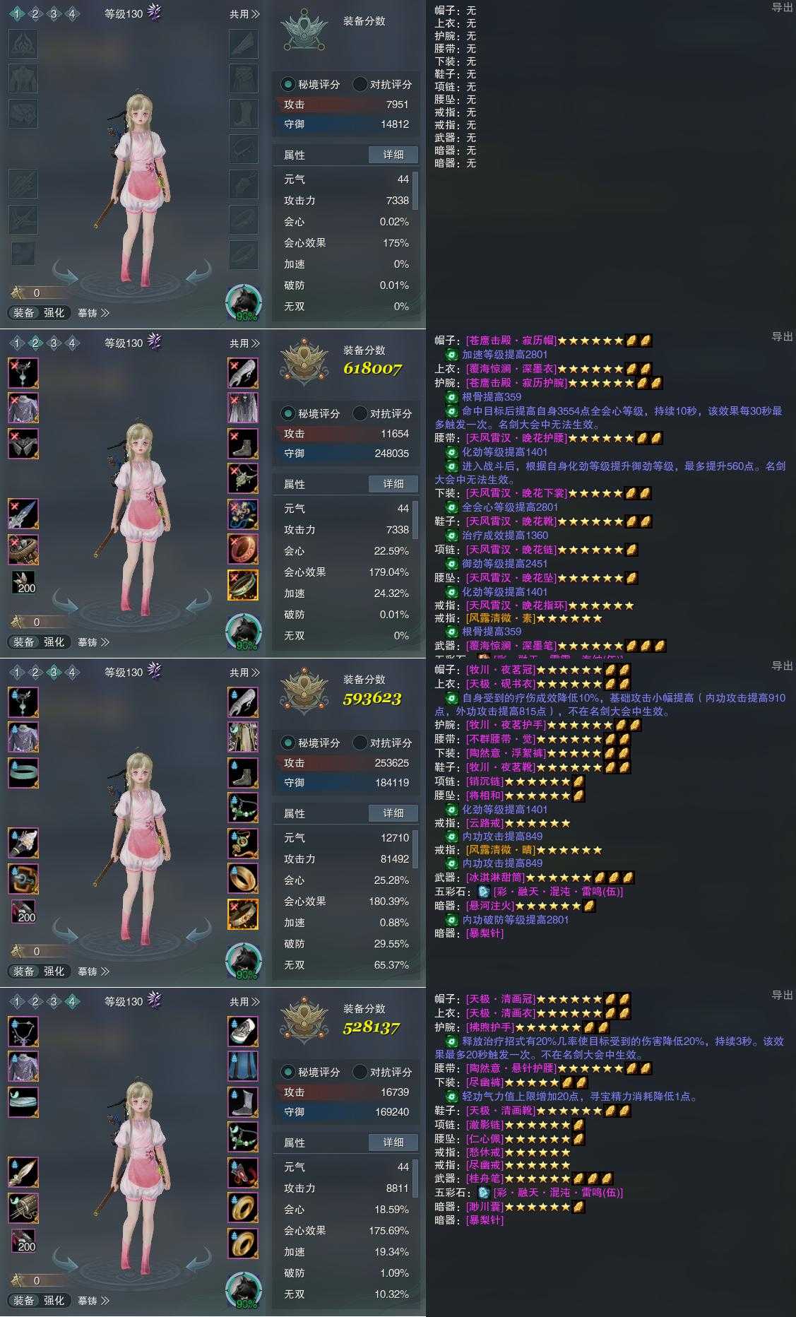 【装备】130级,装备一0,离经易道PVP618007,花间游PVE593623,离经易道装备四528137