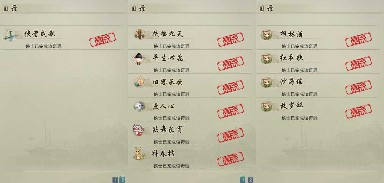 【奇遇】7个[平生心愿, 扶摇九天, 庆舞良宵, 度人心, 旧宴承欢, 侠者成歌, 拜春擂]