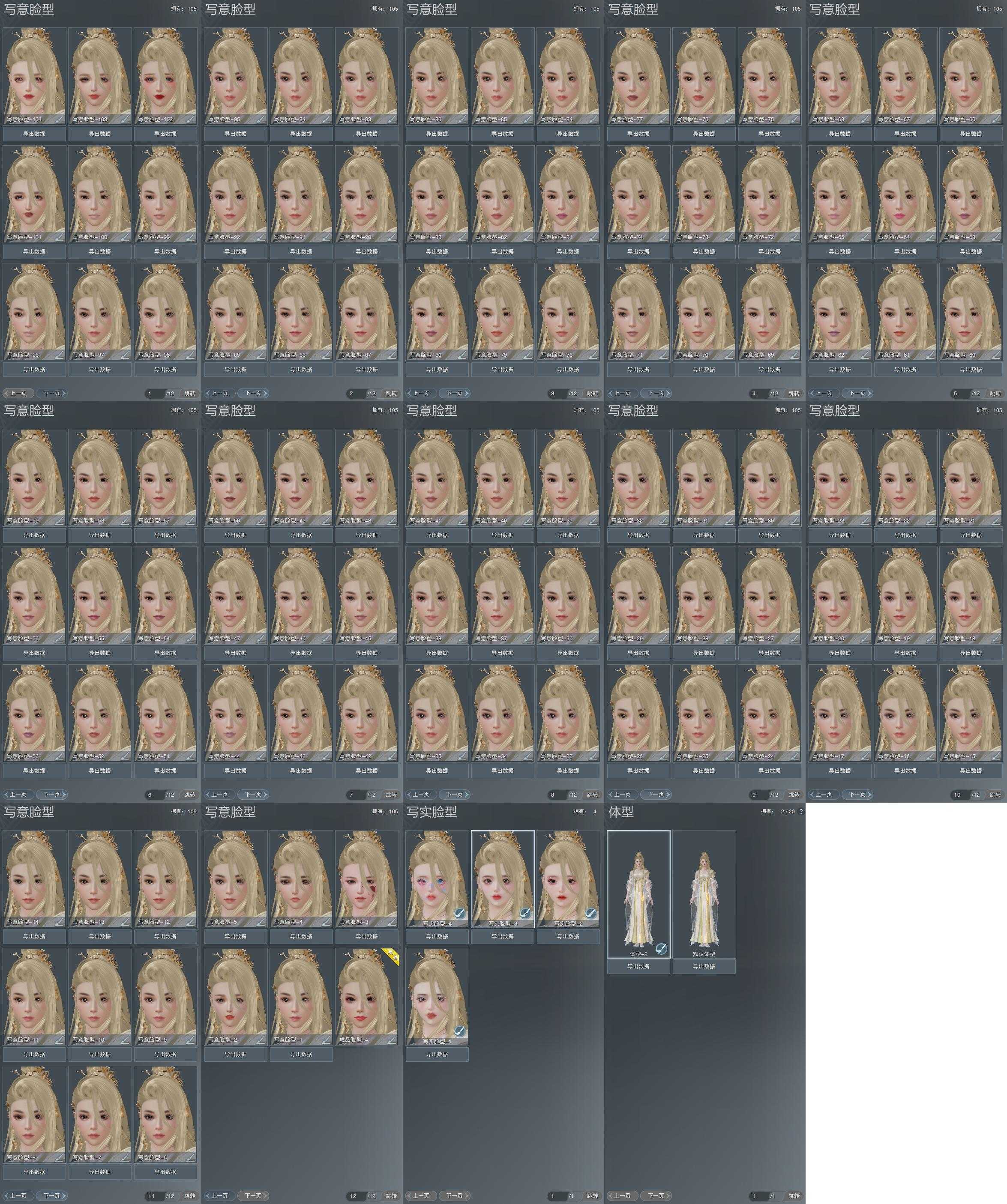 【捏脸】写意脸型105个,写实脸型4个,体型2个