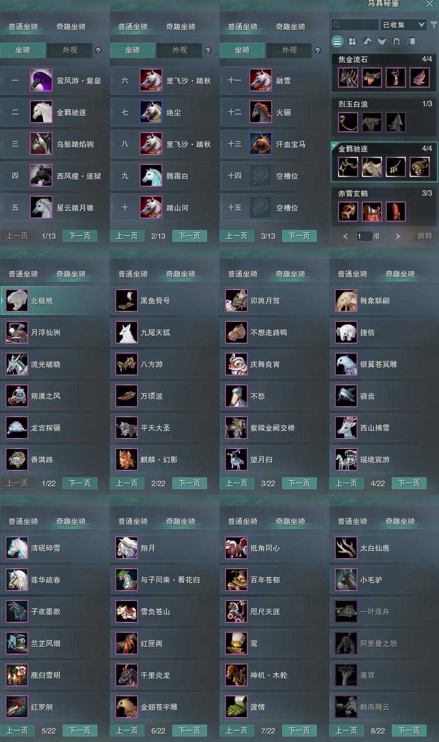 【坐骑】13个[绝尘, 西风瘦逐狱, 星云踏月骓, 里飞沙踏秋, 里飞沙踏秋, 金羁驰逐, 鸾凤游紫皇, 乌鬃踏焰驹]