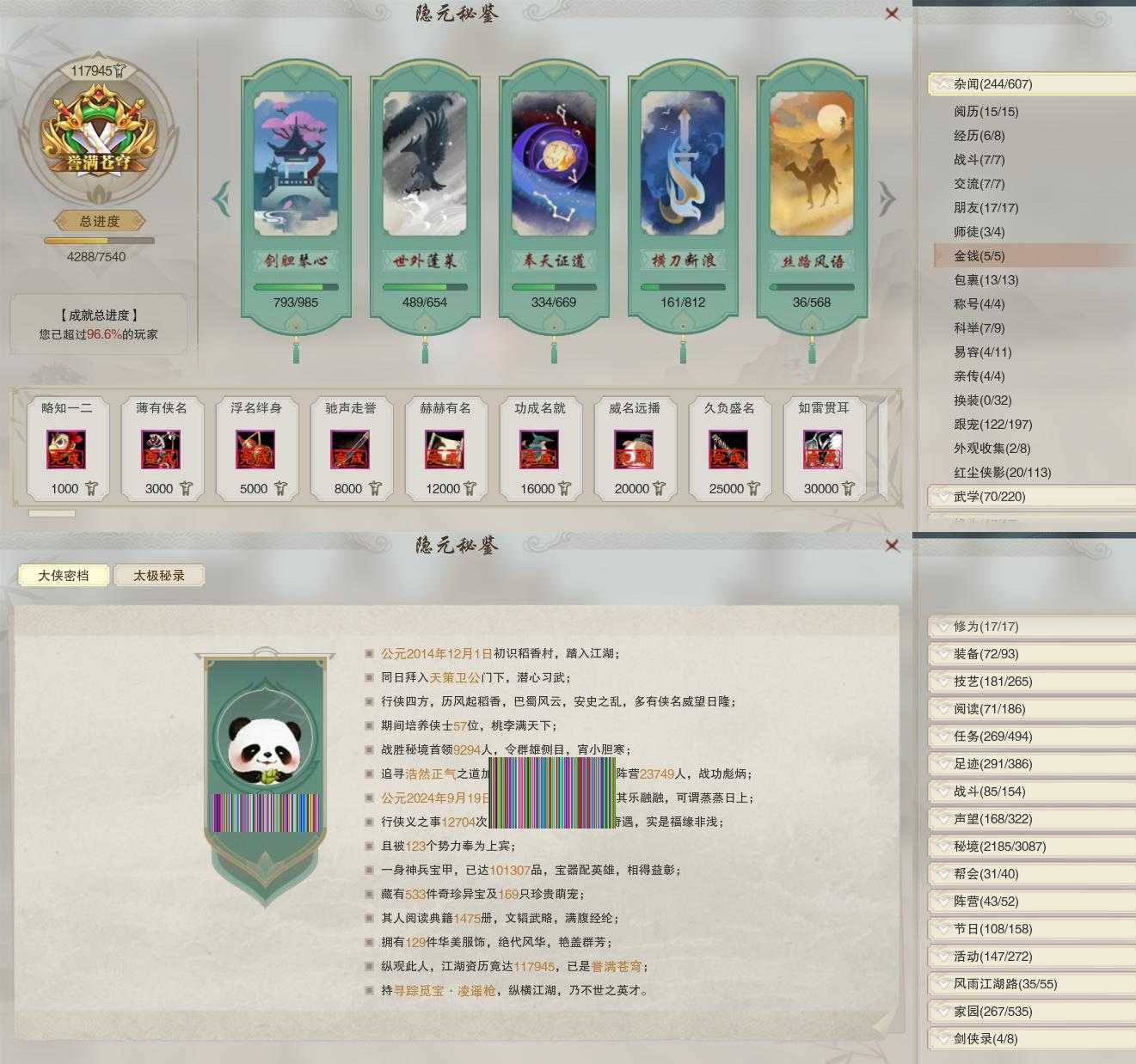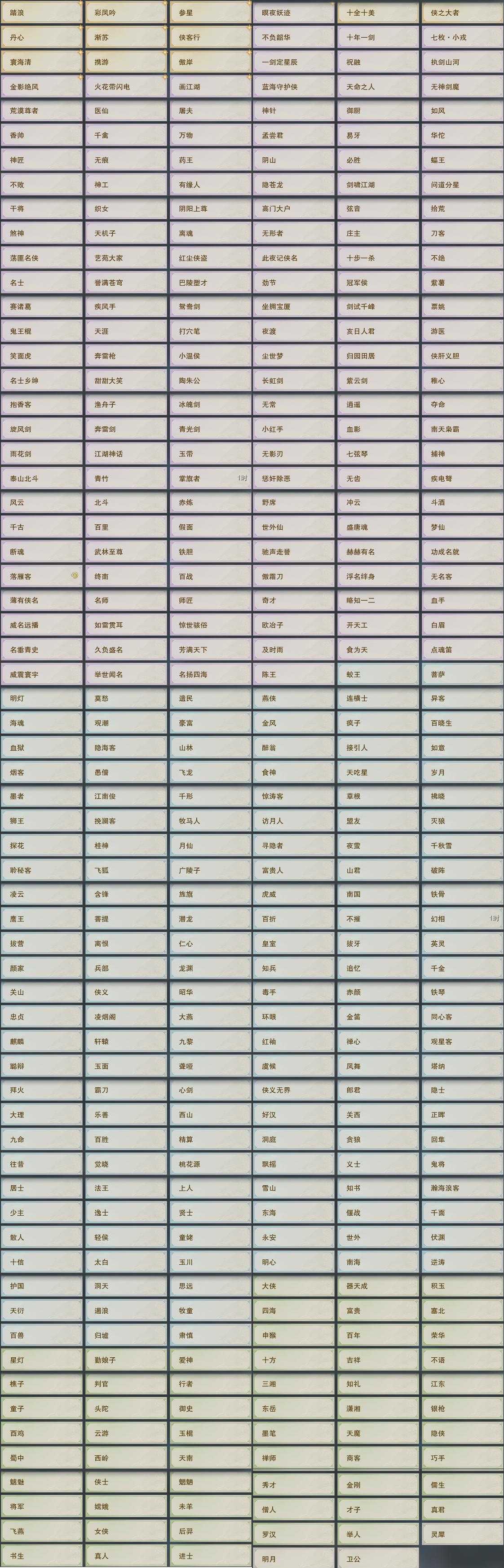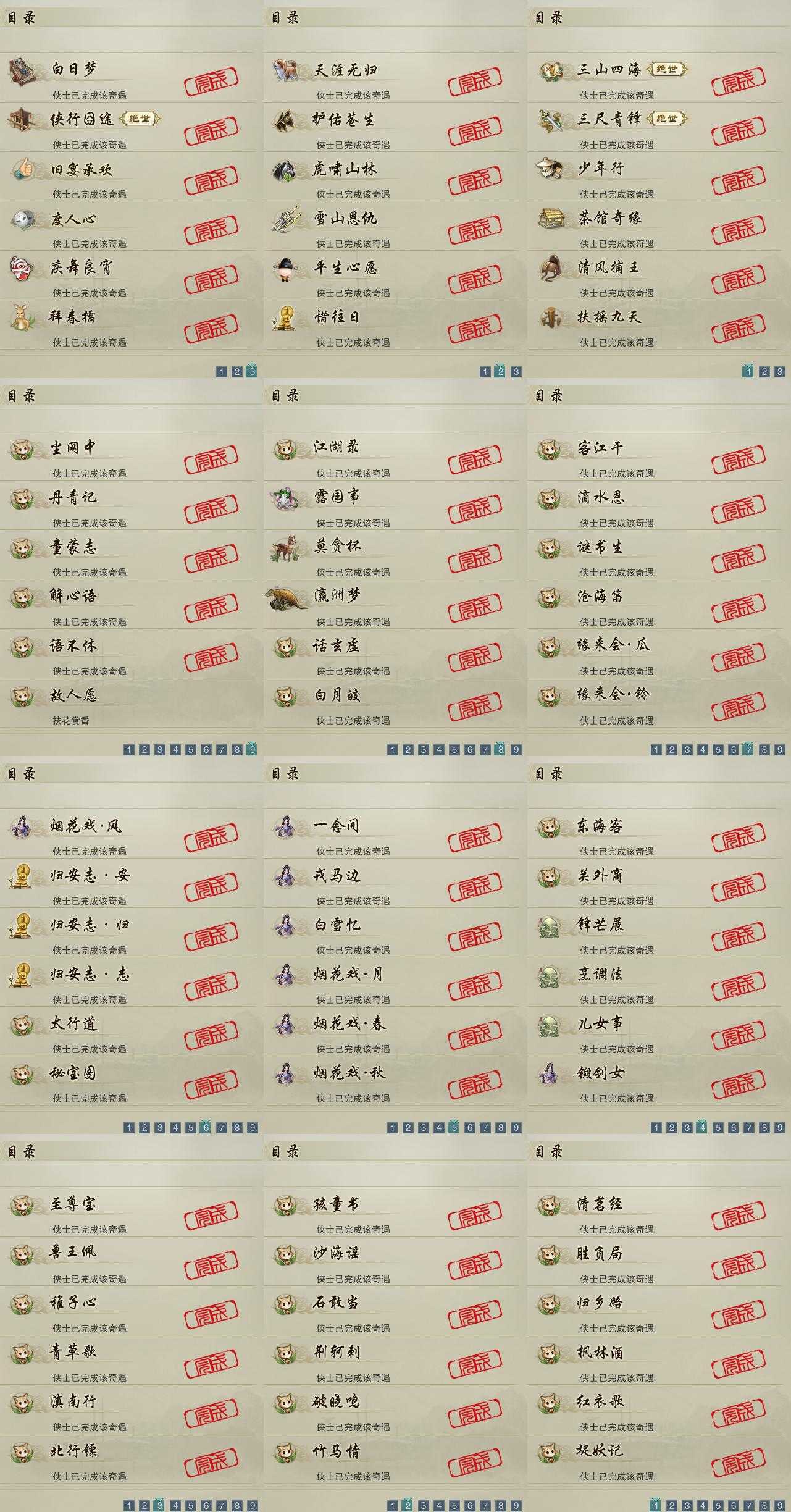 【奇遇】18个[白日梦, 天涯无归, 三山四海, 雪山恩仇, 平生心愿, 惜往日, 虎啸山林, 护佑苍生, 少年行, 三尺青锋, 扶摇九天, 清风捕王, 侠行囧途, 茶馆奇缘, 庆舞良宵, 度人心, 旧宴承欢, 拜春擂]
