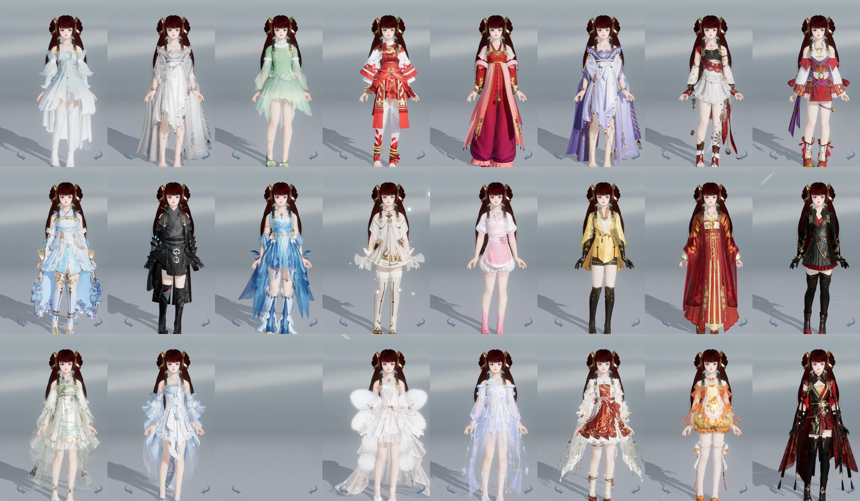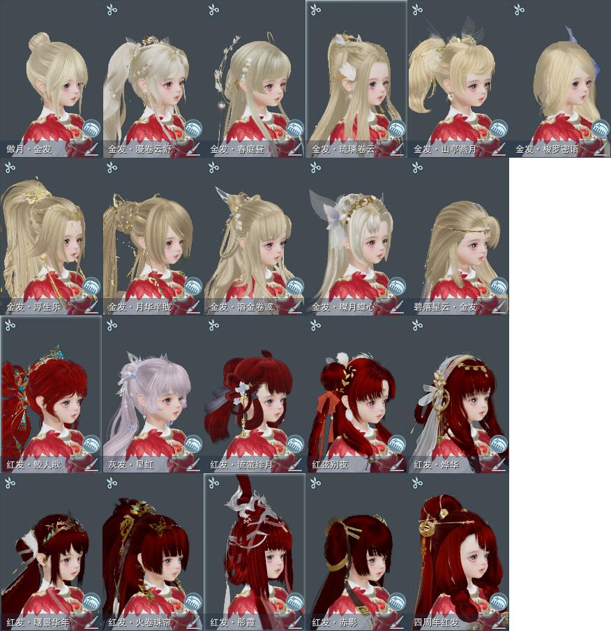 【发型】金发11个[狐金, 资历金, 鼠金, 鸡金, 蝶金, 喵金, 国金, 苏金, 龙女金, 云金, 傲月金发], 红发10个[四红, 五红, 六红, 七红, 羊红, 猴红, 鸡红, 小资历红, 十五红, 二代灰], 黑发33个, 白发15个, 盒子发型[一代蓝中秋白, 四代七夕黑发, 雪月白发, 四代七夕白发, 绿中秋黑发, 浮岚黑发, 绿中秋白发, 浮岚白发, 红椿山黑发, 红黑妖眸盒黑发, 蓝兔盒黑发, 紫沧洲盒黑发, 白幽馥黑发, 九七黑发, 柿盒黑发, 镰刀黑发, 九七白发, 镰刀白发], 总页数8