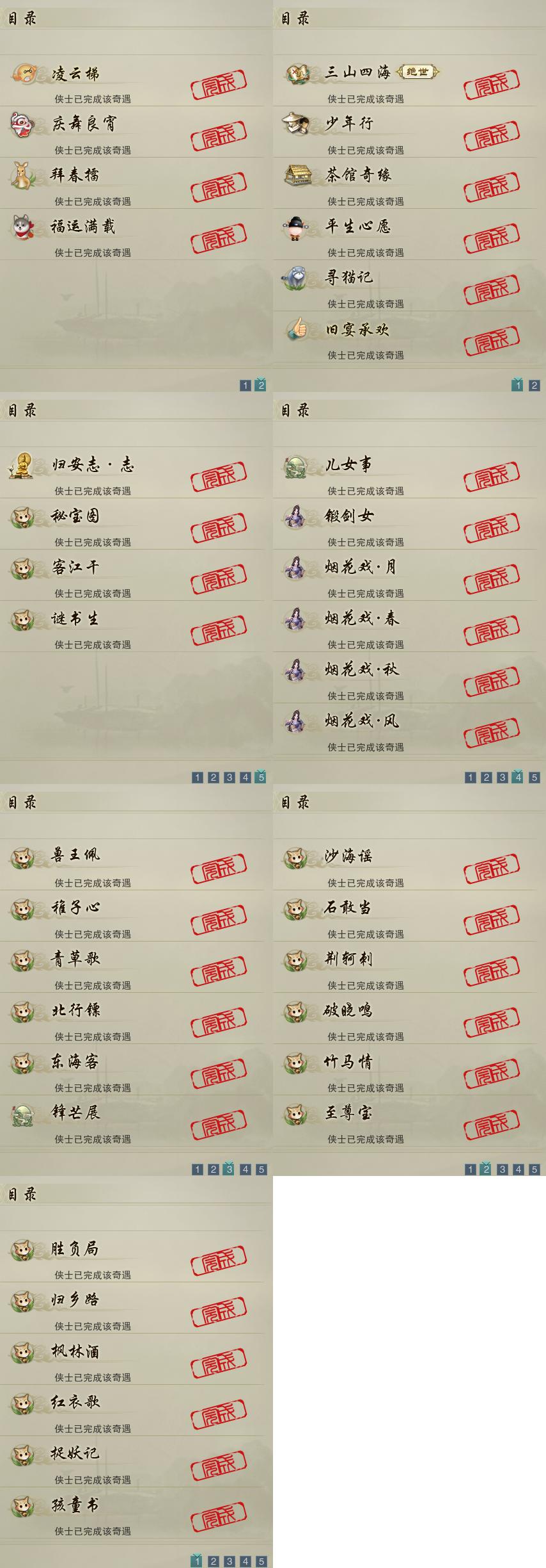 【奇遇】10个[三山四海, 平生心愿, 少年行, 茶馆奇缘, 寻猫记, 庆舞良宵, 凌云梯, 旧宴承欢, 拜春擂, 福运满载]