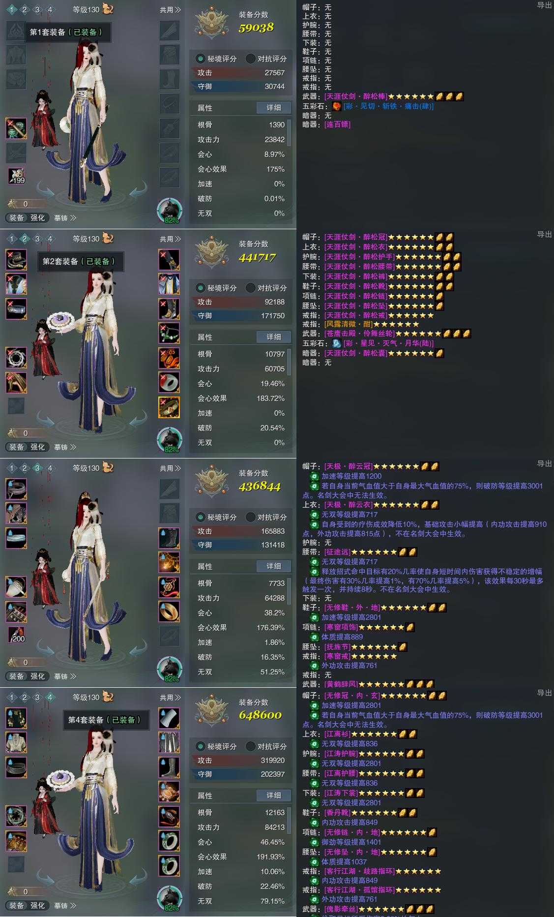 【装备】130级,装备一59038,笑尘诀装备二441717,笑尘诀PVE436844,笑尘诀PVE648600