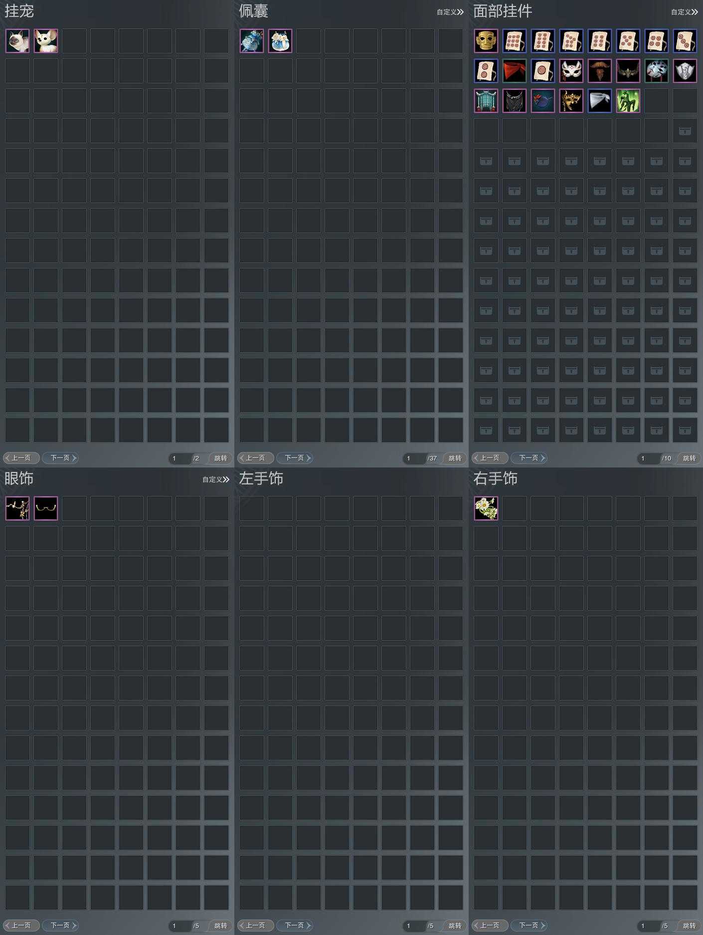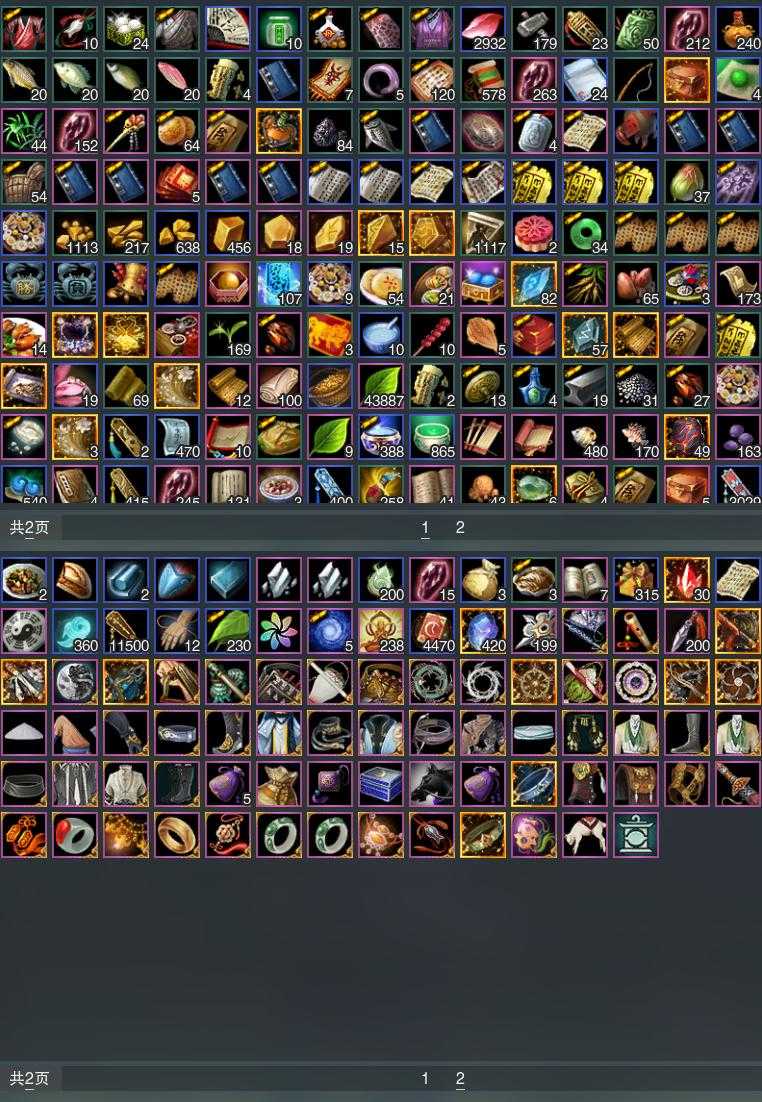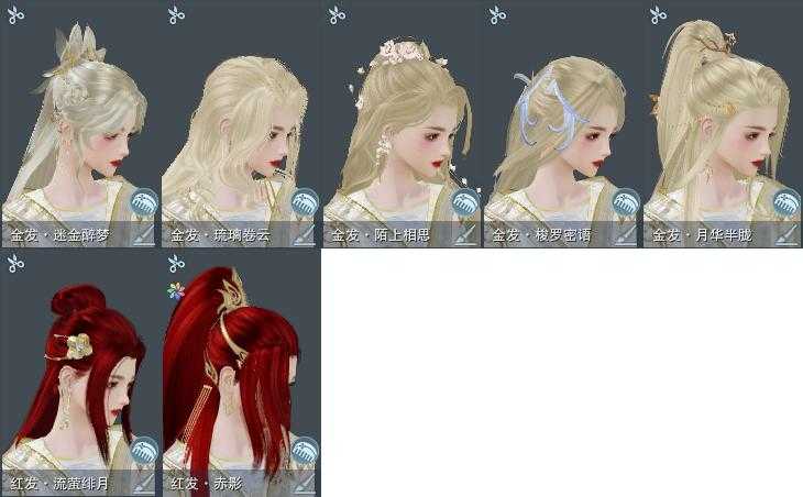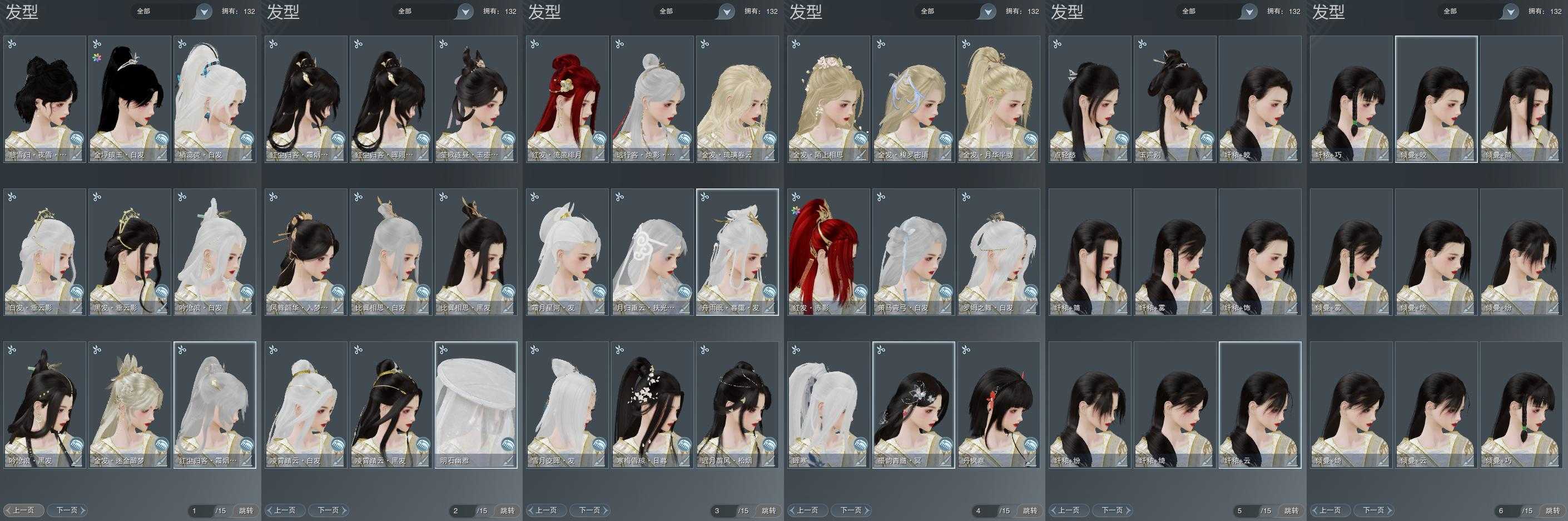 【发型】金发6个[资历金, 鸡金, 考金, 龙女金, 牛金, 云金], 红发2个[五红, 小资历红], 黑发17个, 白发15个, 盒子发型[踏云黑发, 一代花朝白白, 狗白, 白端午白发, 雪月白发, 踏云白发, 五代七夕黑发, 入梦黑发, 五代七夕白发, 唐风玉壶黑发, 黑红尘黑发, 白红尘黑发, 白红尘白发, 竹笛黑发, 竹笛白发, 粉毛衣黑发], 总页数6