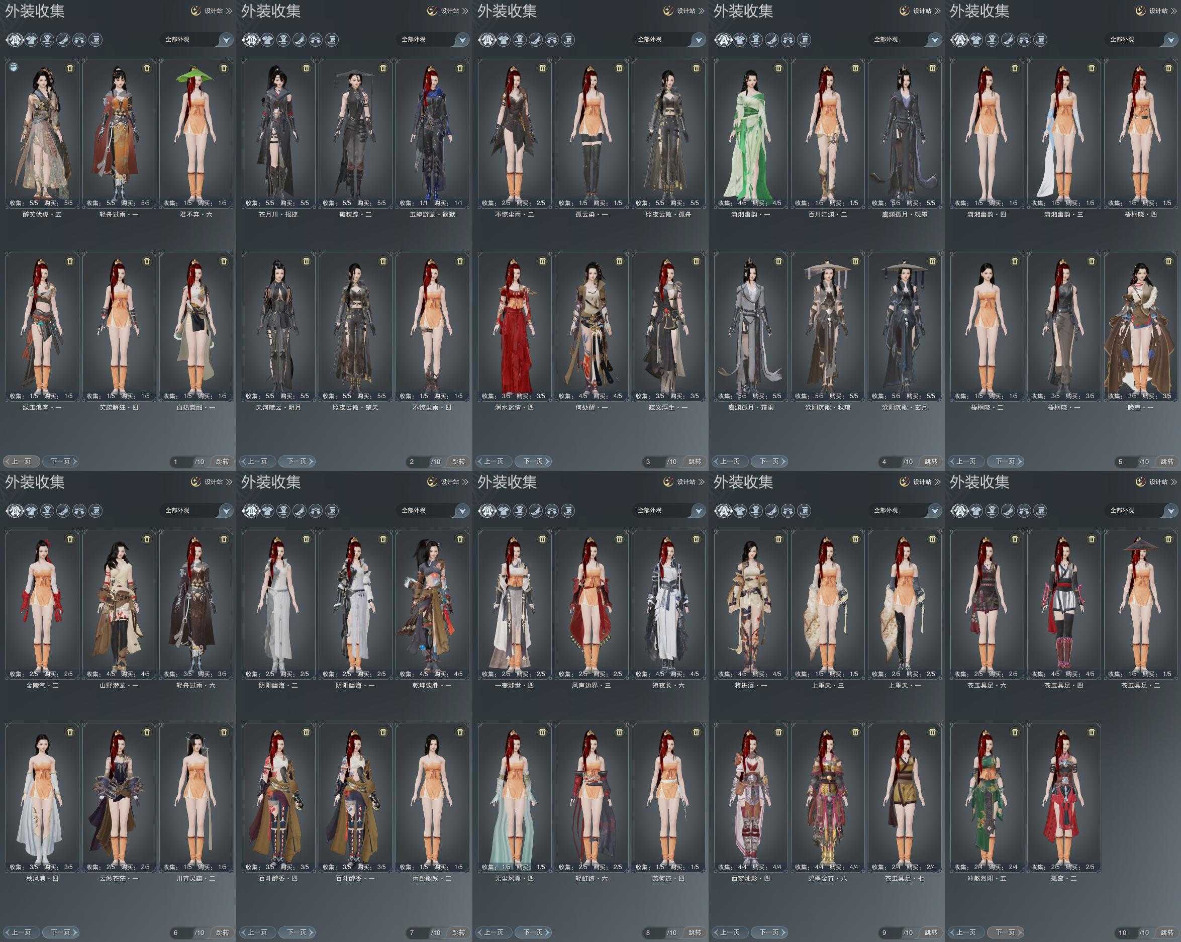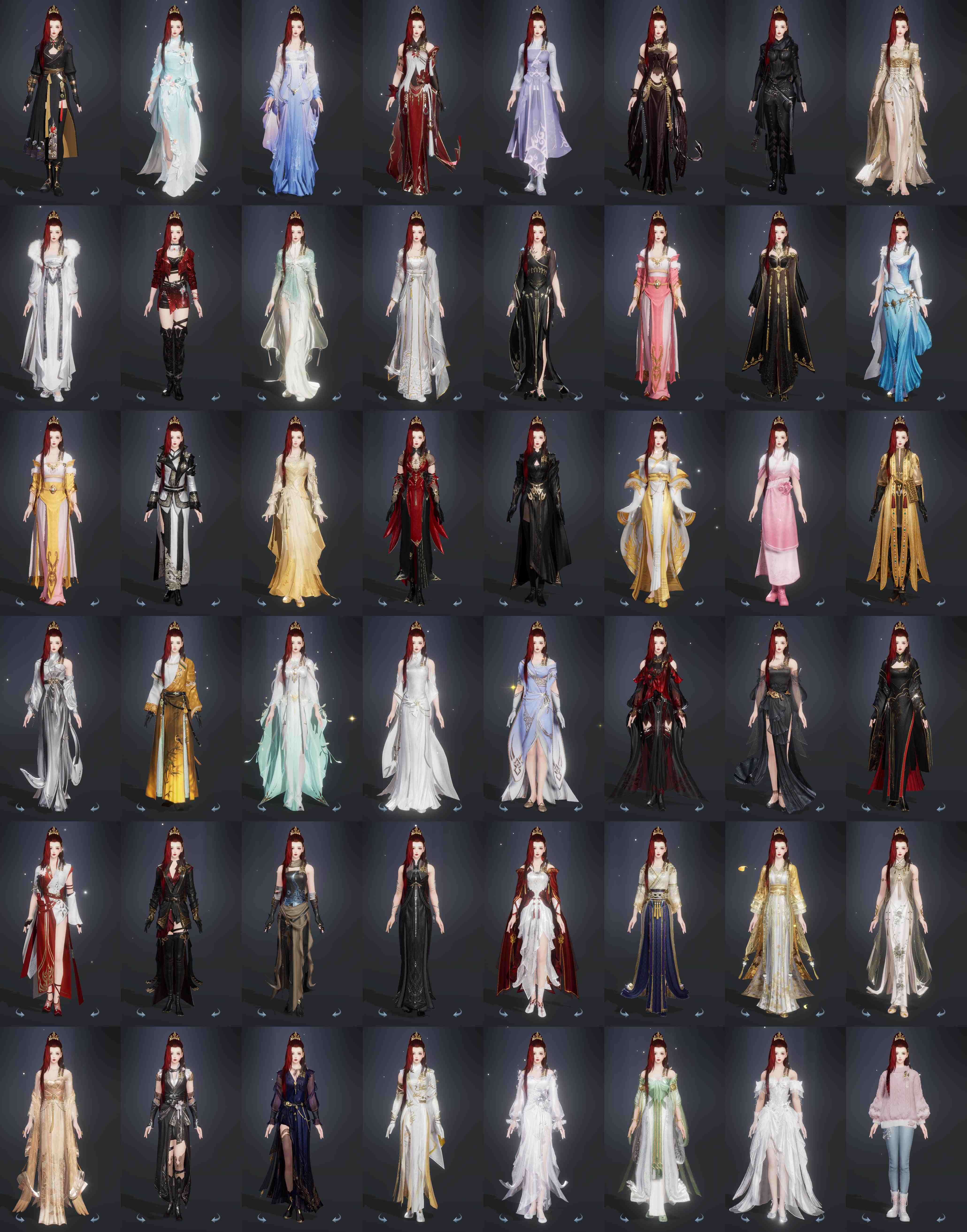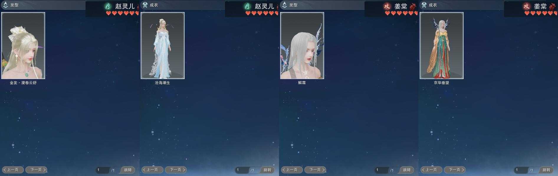 【发型】金发6个[资历金, 鸡金, 考金, 龙女金, 牛金, 云金], 红发2个[五红, 小资历红], 黑发17个, 白发15个, 盒子发型[踏云黑发, 一代花朝白白, 狗白, 白端午白发, 雪月白发, 踏云白发, 五代七夕黑发, 入梦黑发, 五代七夕白发, 唐风玉壶黑发, 黑红尘黑发, 白红尘黑发, 白红尘白发, 竹笛黑发, 竹笛白发, 粉毛衣黑发], 总页数6