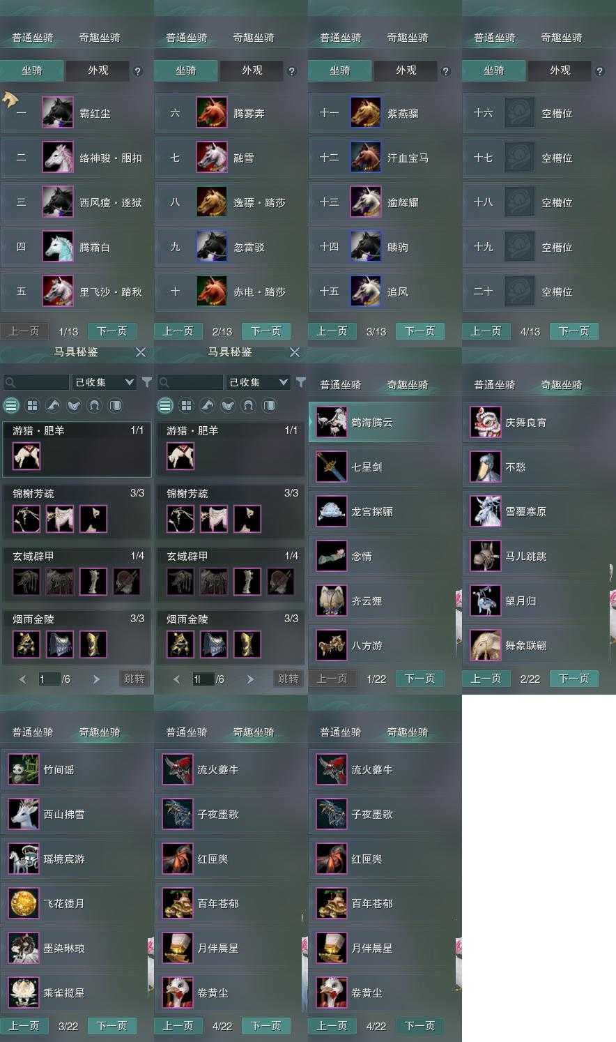 【坐骑】15个[西风瘦逐狱, 里飞沙踏秋, 络神骏胭扣, 霸红尘]